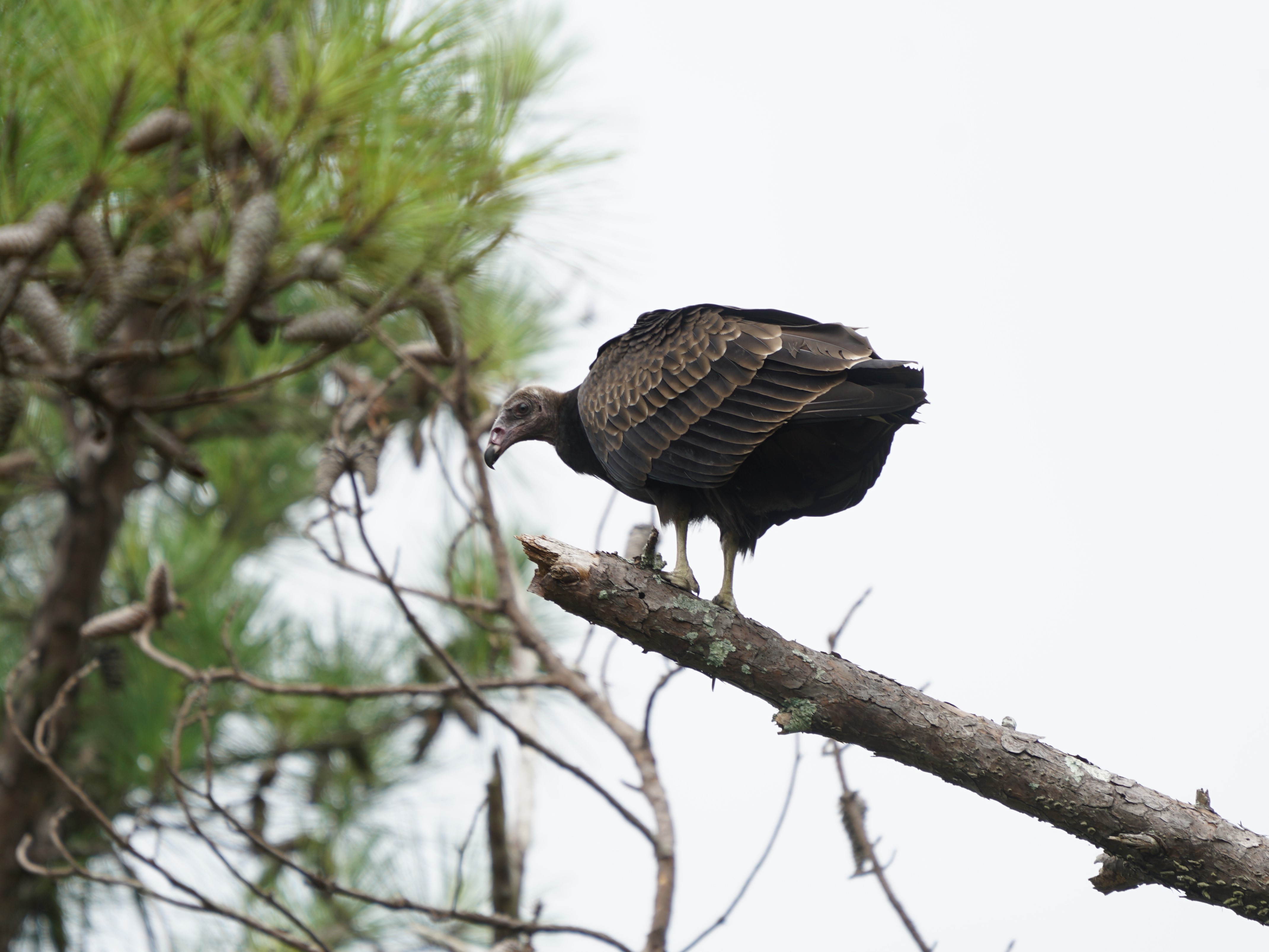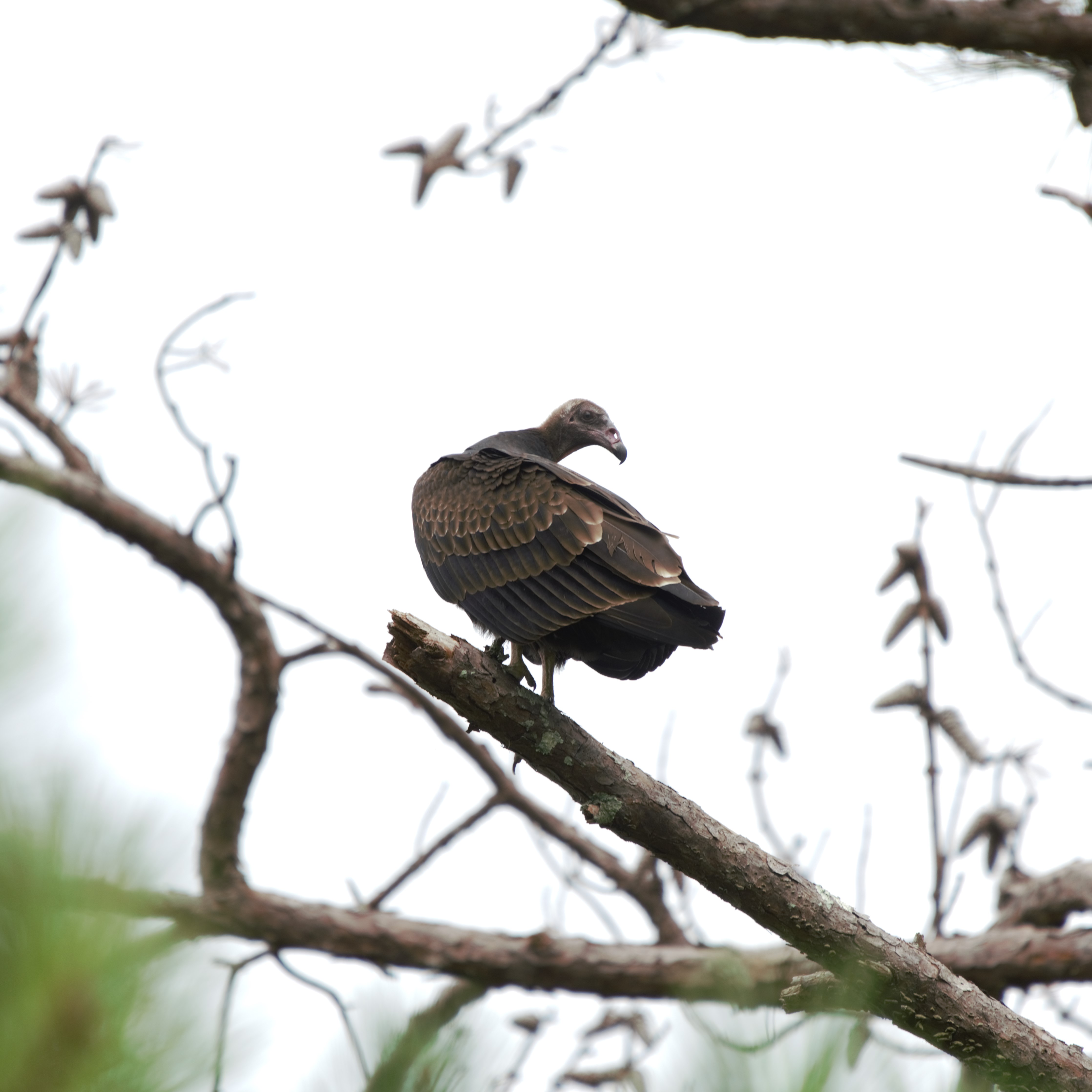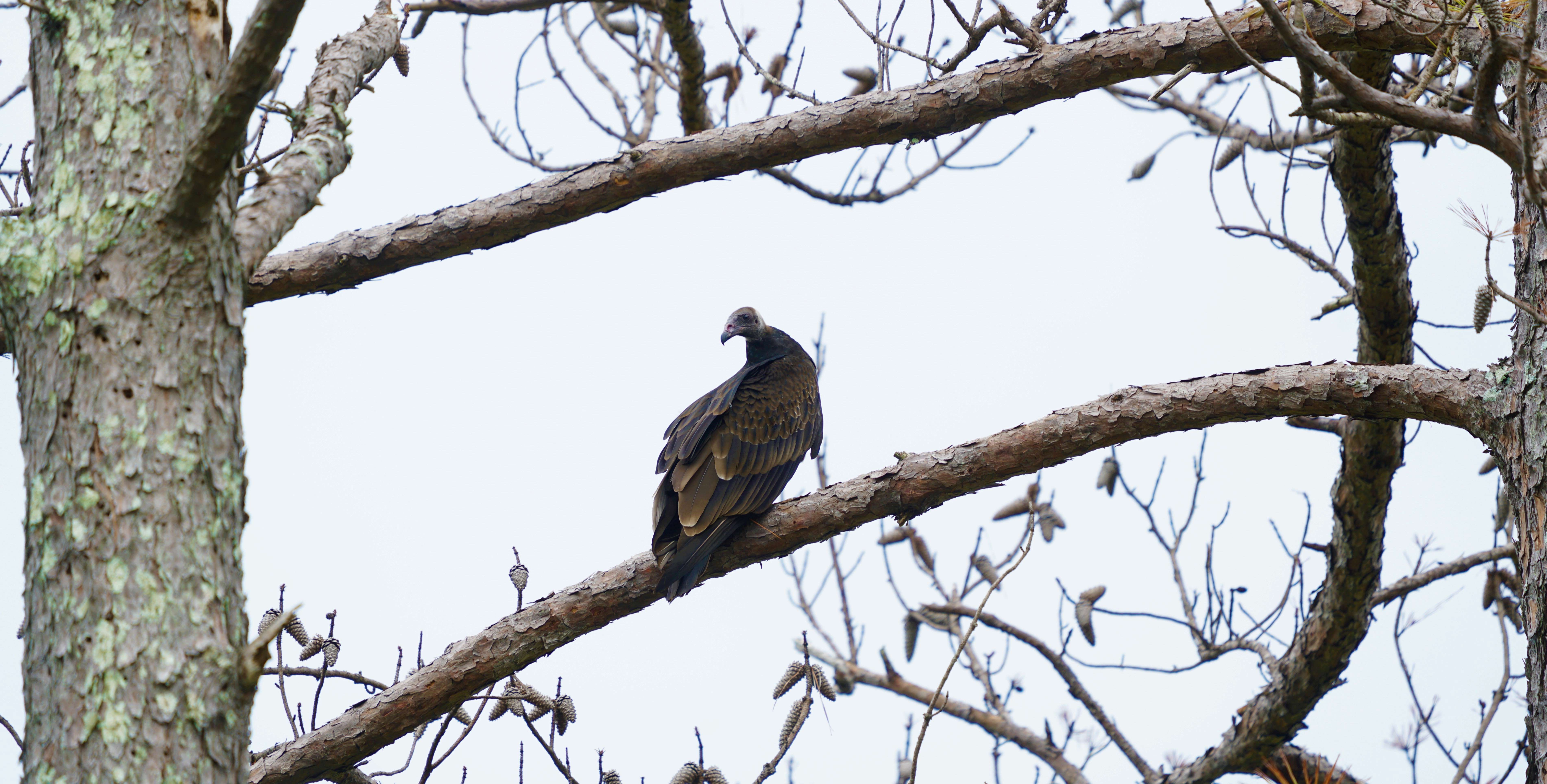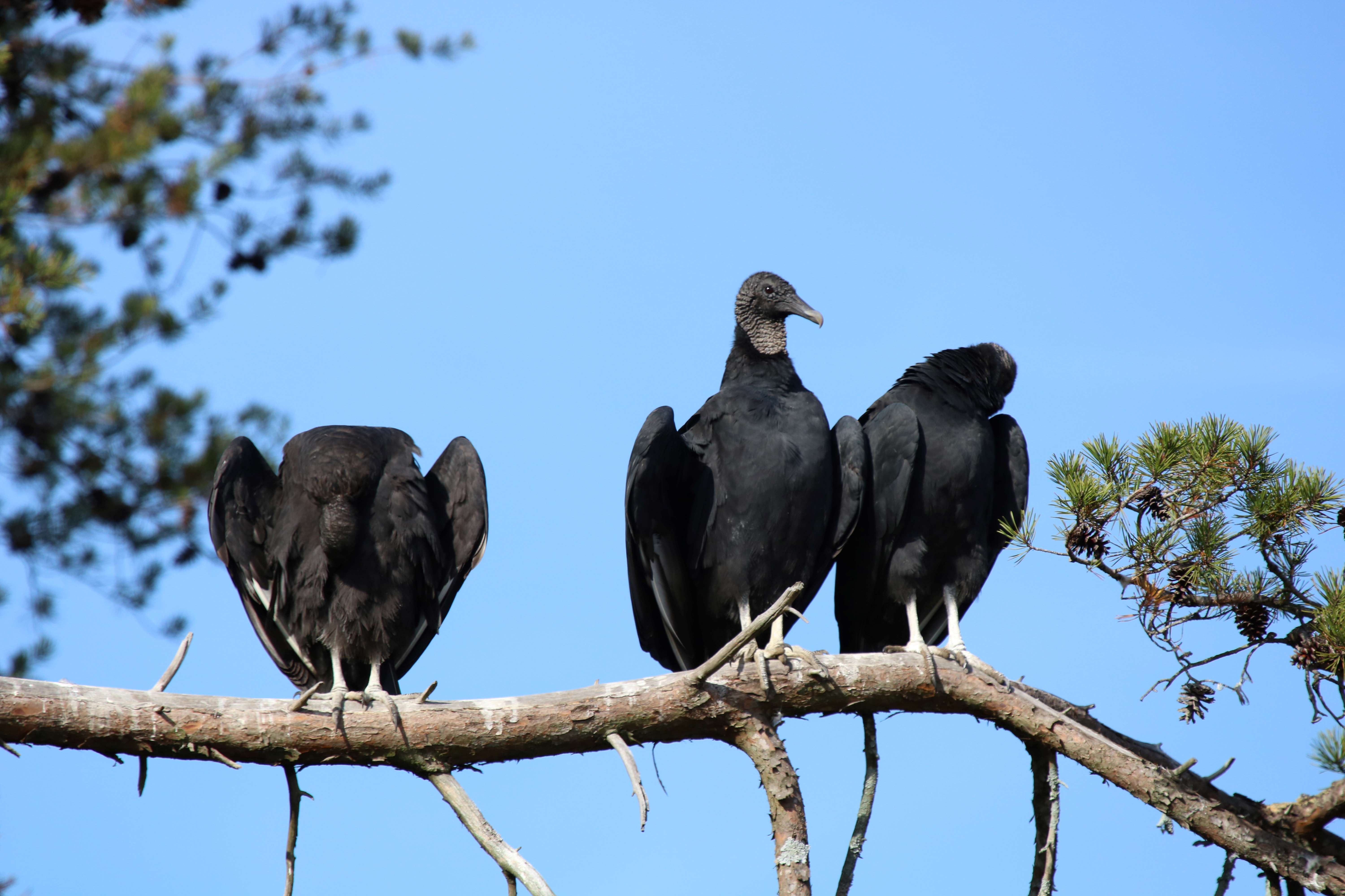 The black vulture is primarily black, as its name suggest, with a white patch near each wing tip. The head is bare and grayish in color. Compared to the turkey vulture, it has a short tail. When in flight, it flaps its shorter and rounder wings more often and more rapidly than the turkey vulture.