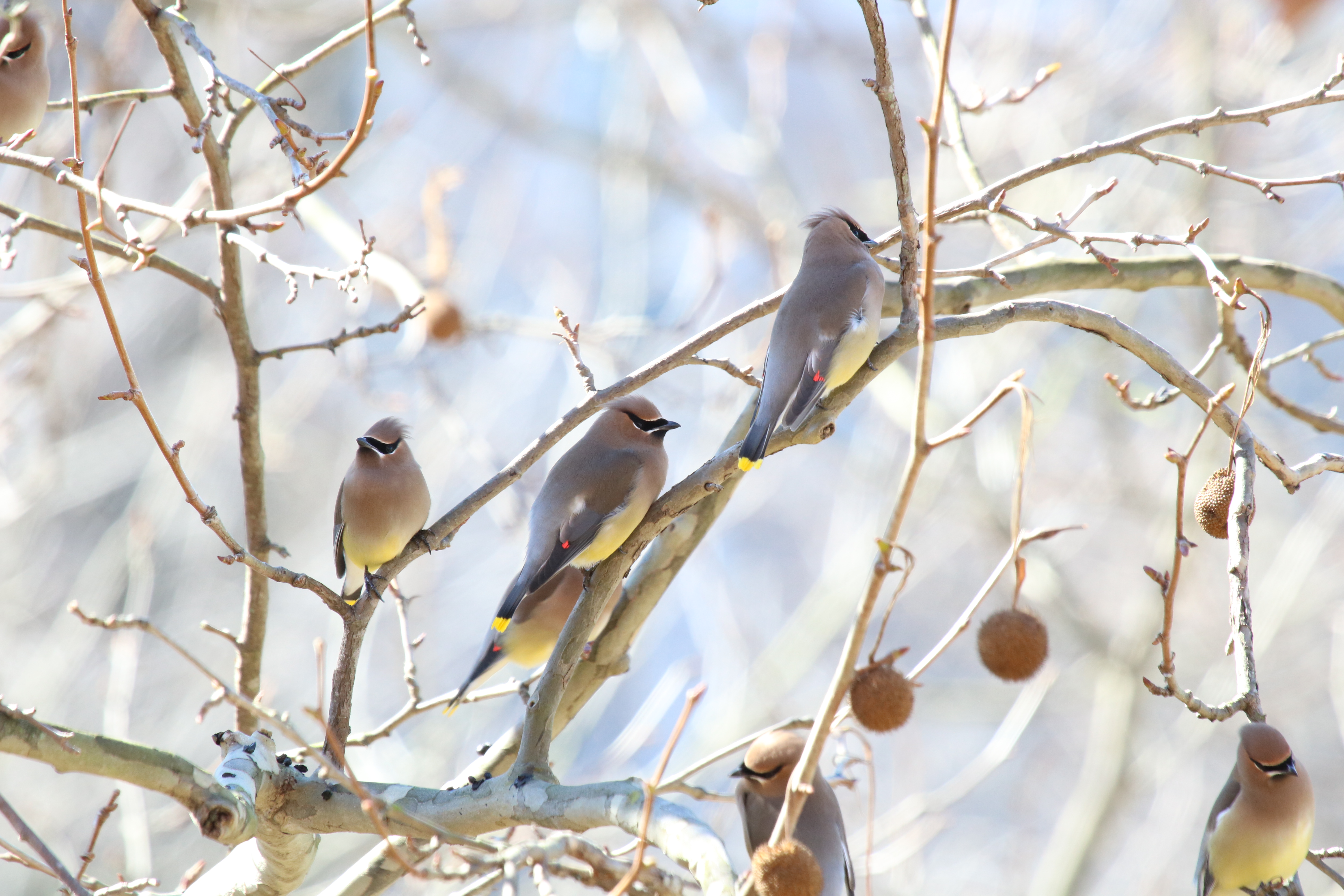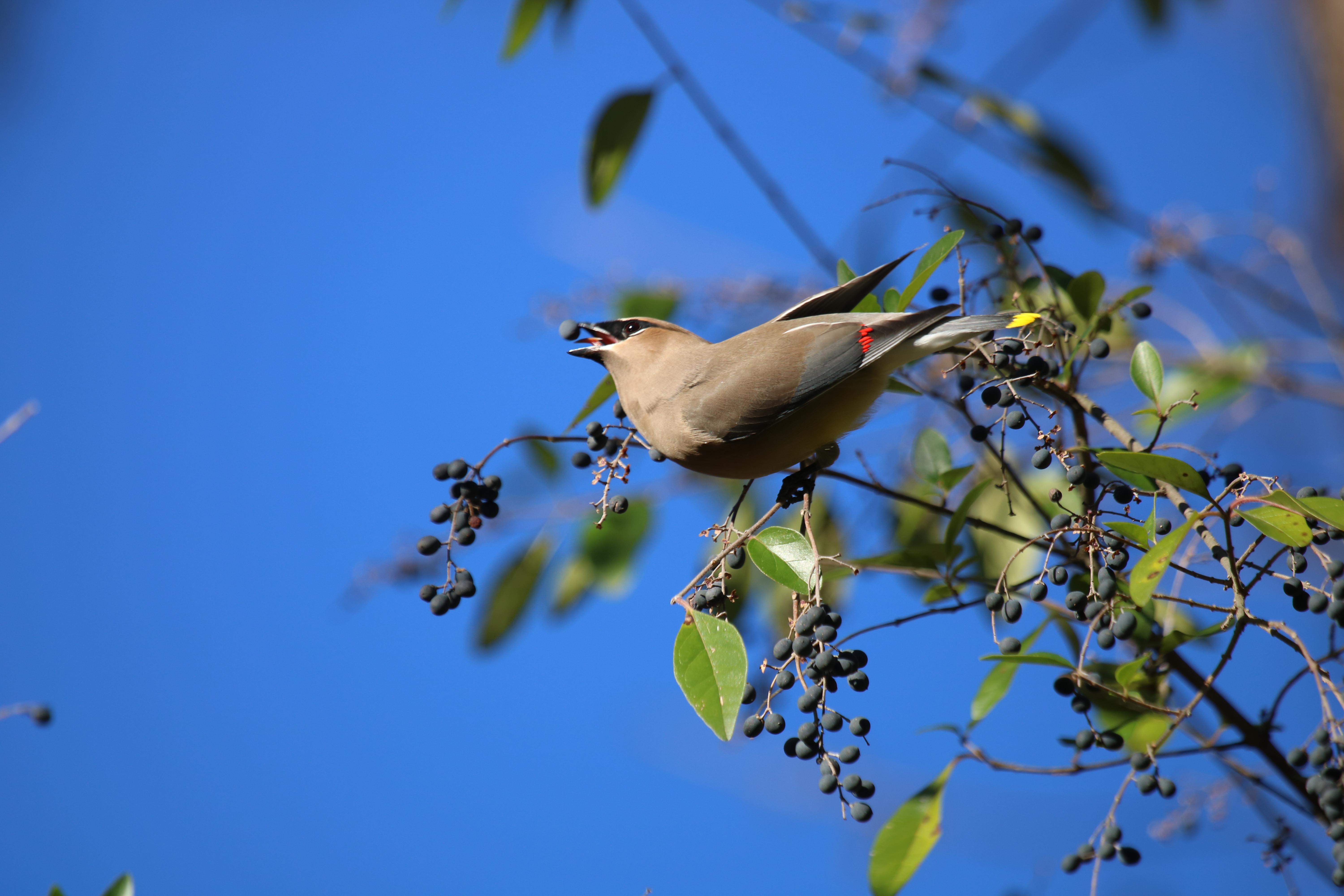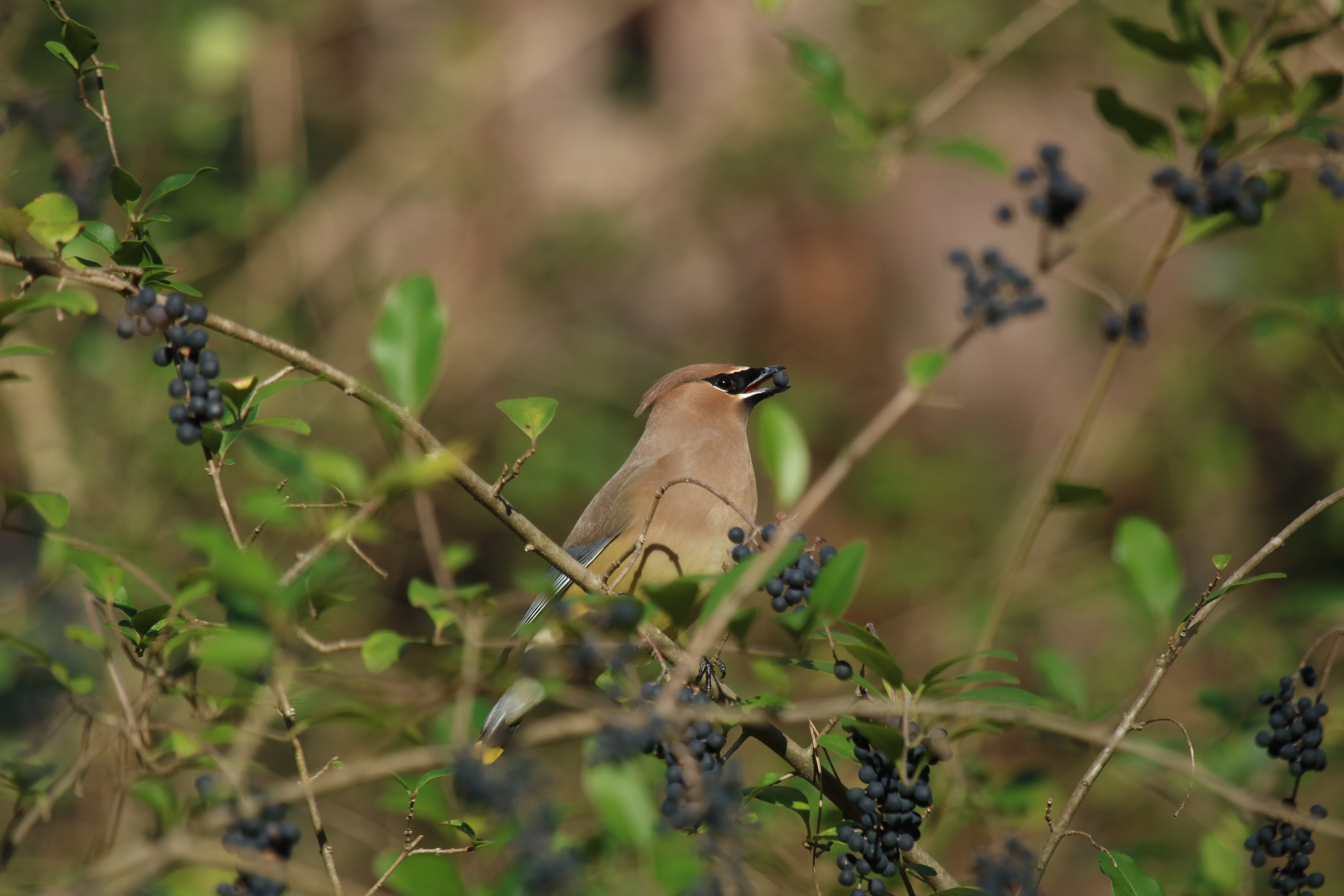 Cedar Waxwings can be found in areas with trees and shrubs that produce fruits, such as hackberry, red mulberry, eastern red cedar, black cherry, and American holly.