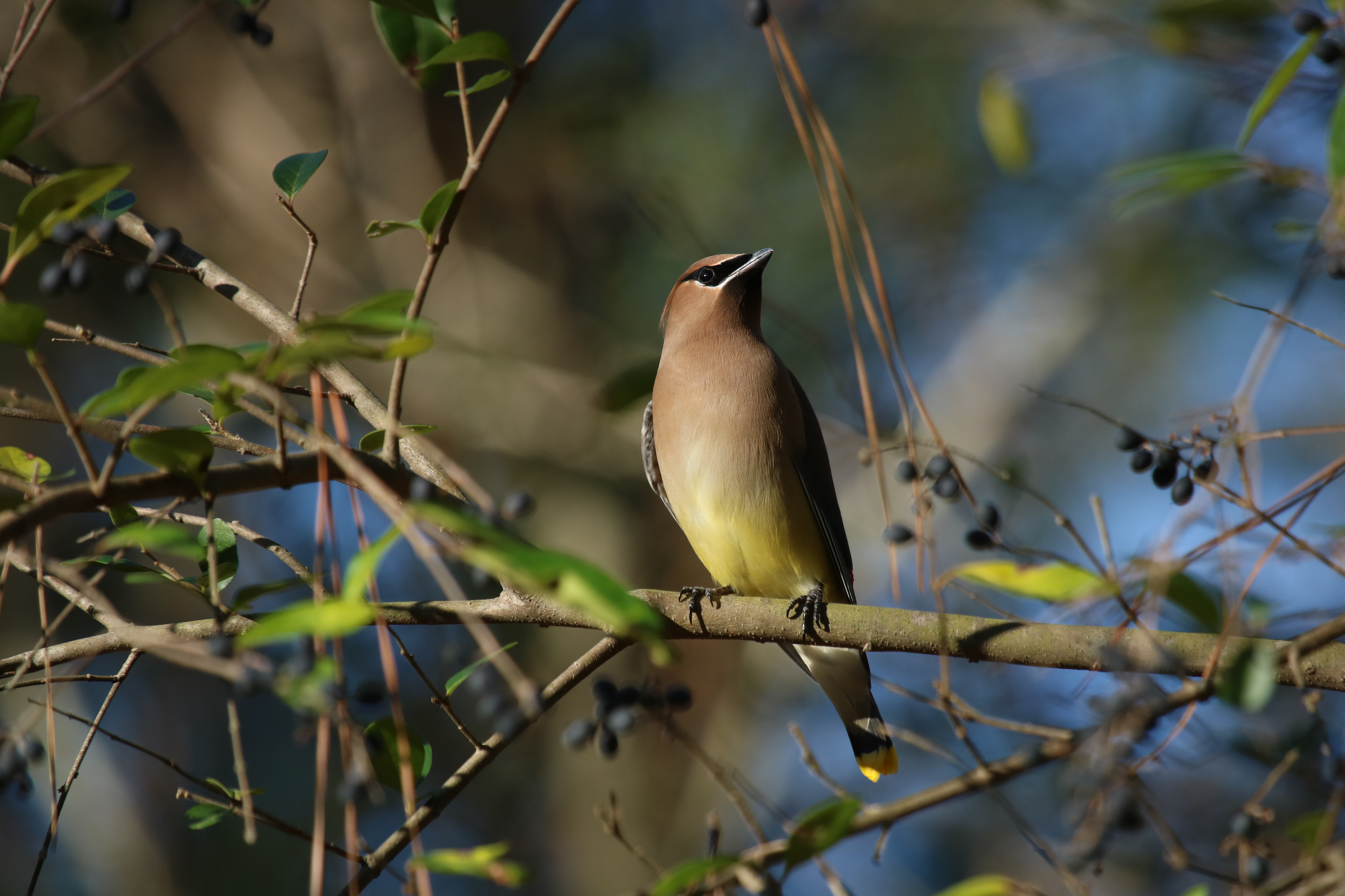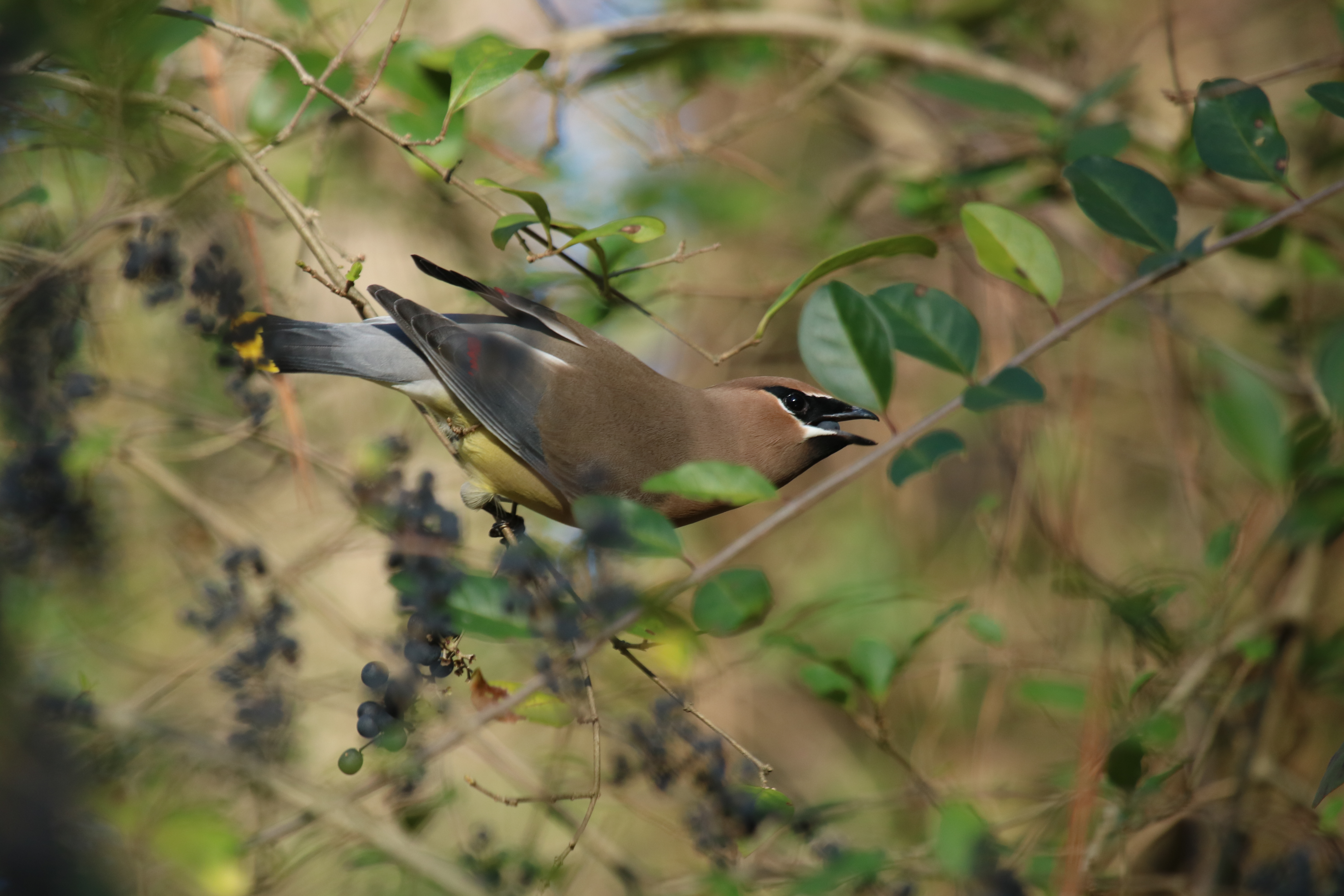 Cedar Waxwings are social birds. They move in flocks across Alabama during the fall, winter, and spring season stripping trees of their berries. They sit in fruiting trees swallowing berries whole, or pluck them in mid-air with a brief fluttering hover. They also course over water for insects, flying like tubby, slightly clumsy swallows.