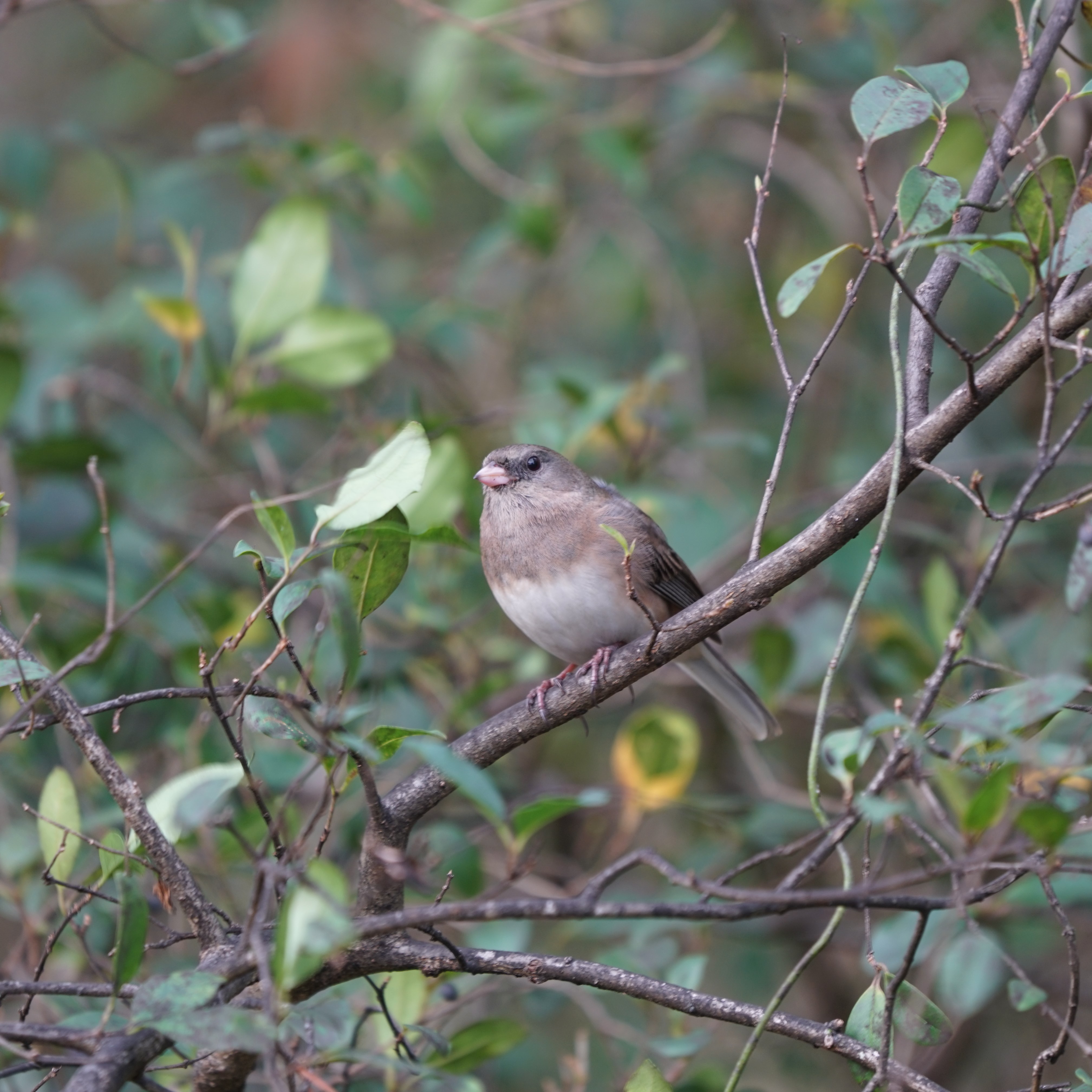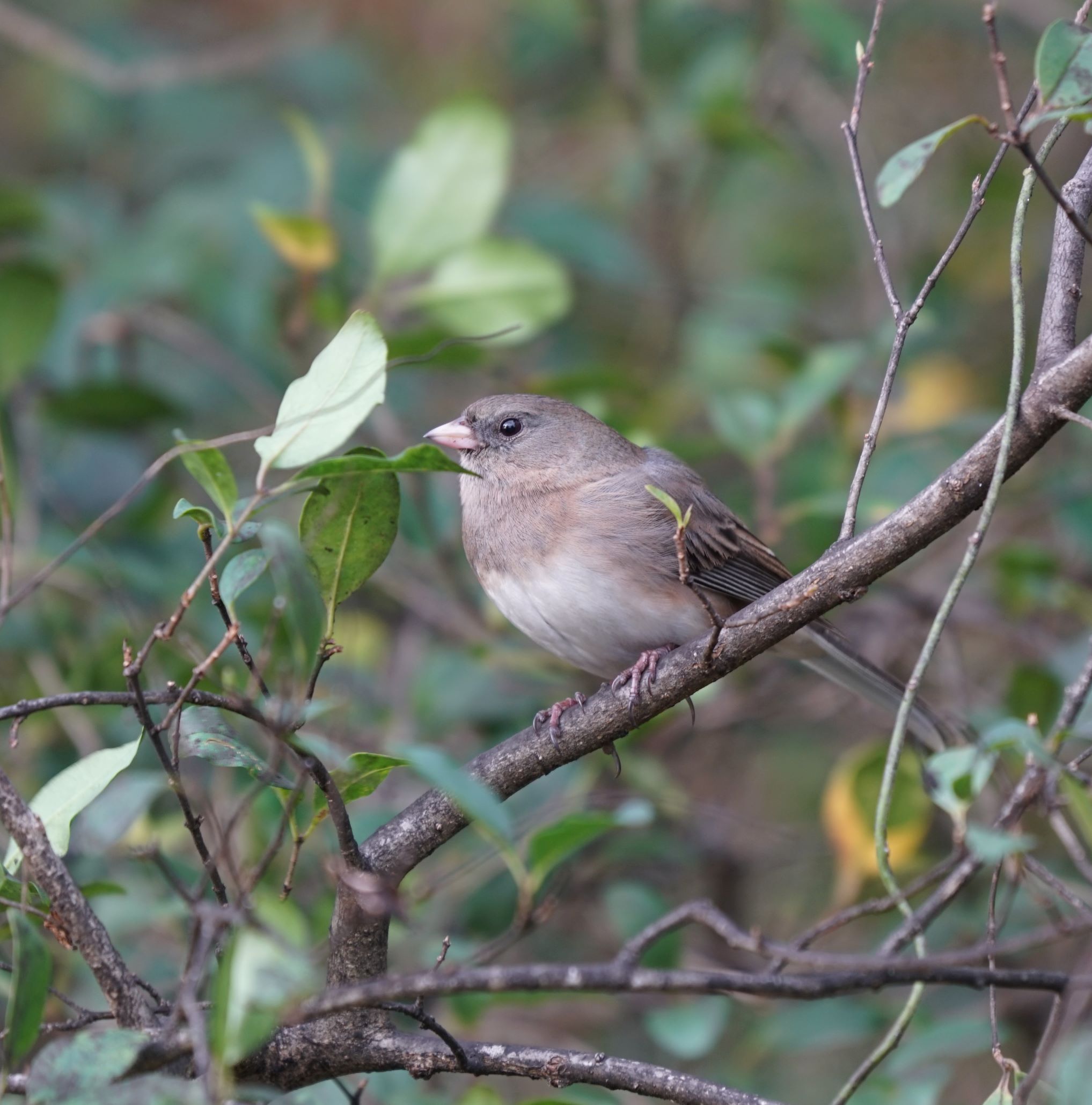 Juncos vary in appearance across the country, however in Alabama they are primarily dark gray or brown birds brightened up by a pink bill and white outer tail feathers that periodically flash open, particularly in flight.