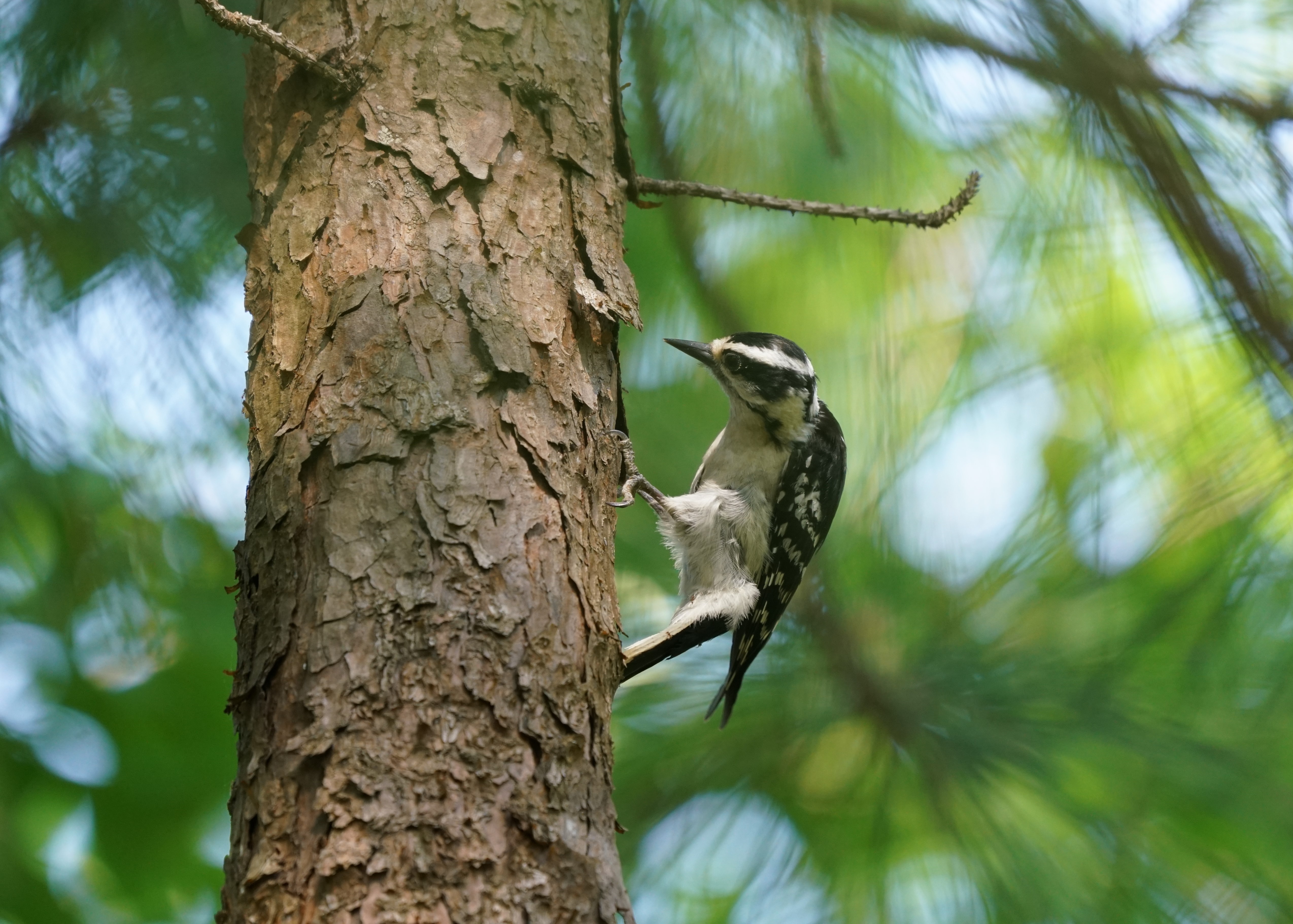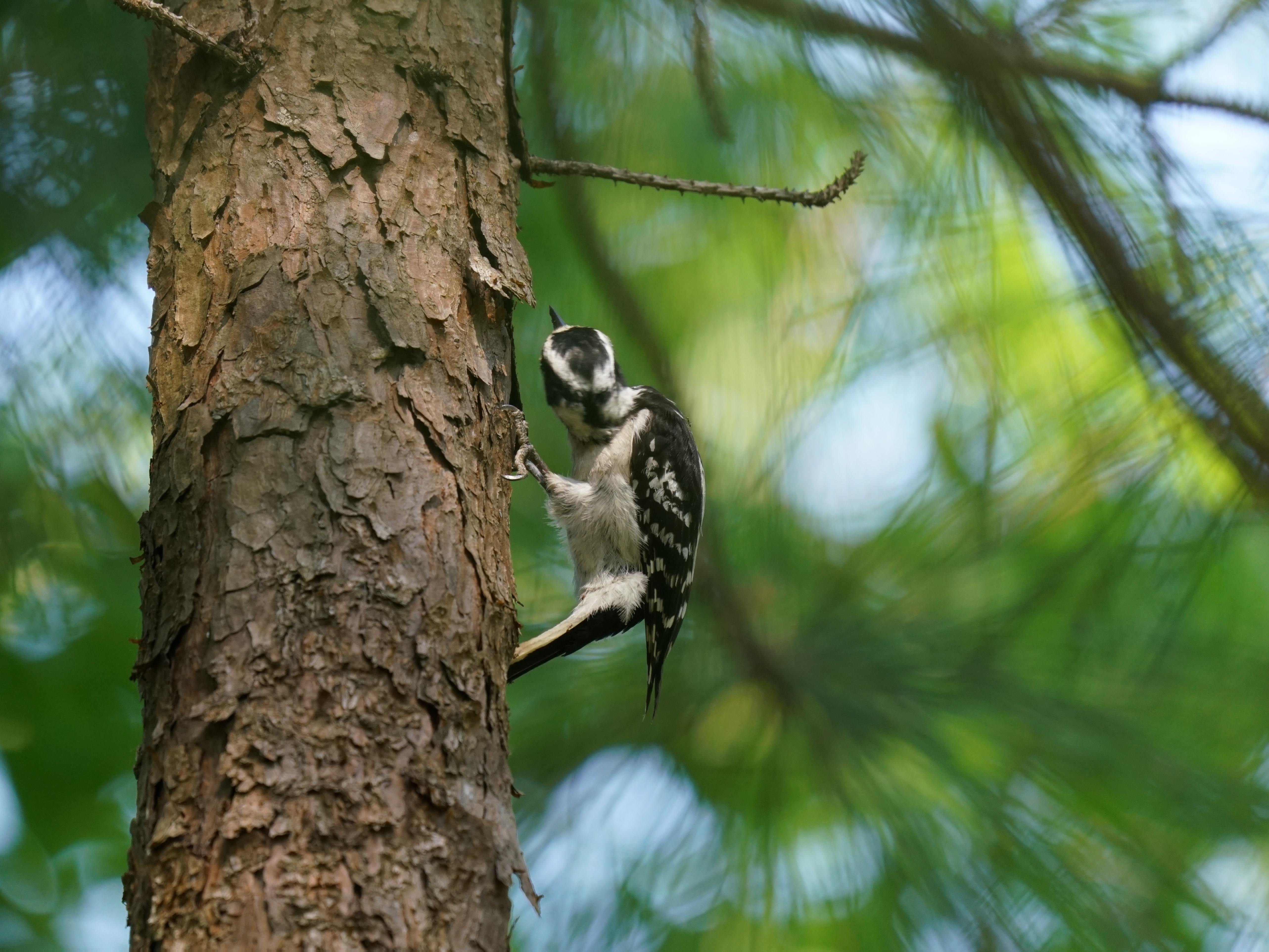 Downy Woodpeckers hitch around tree limbs and trunks or drop into tall weeds to feed on galls, moving more acrobatically than larger woodpeckers. Their rising-and-falling flight style is distinctive of many woodpeckers. You’ll often see them drumming on trees and then listening for any insects that move inside. In spring and summer, Downy Woodpeckers make lots of noise, both with their shrill whinnying call and by drumming on trees.