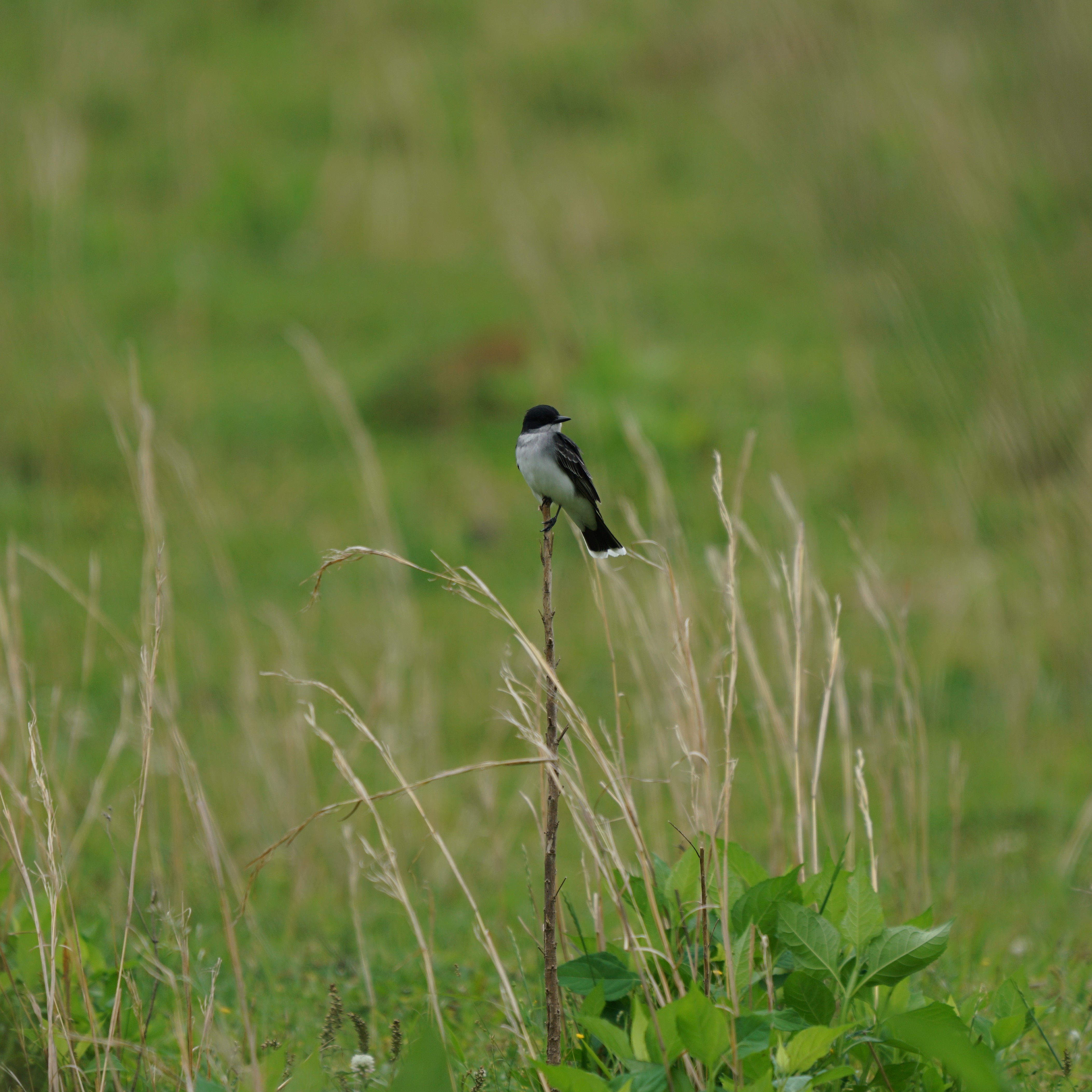 Eastern Kingbirds often perch in the open atop trees or along utility lines or fences. They fly with very shallow, rowing wingbeats and a raised head, usually accompanied by metallic, sputtering calls. Eastern Kingbirds are visual hunters, sallying out from perches to snatch flying insects.