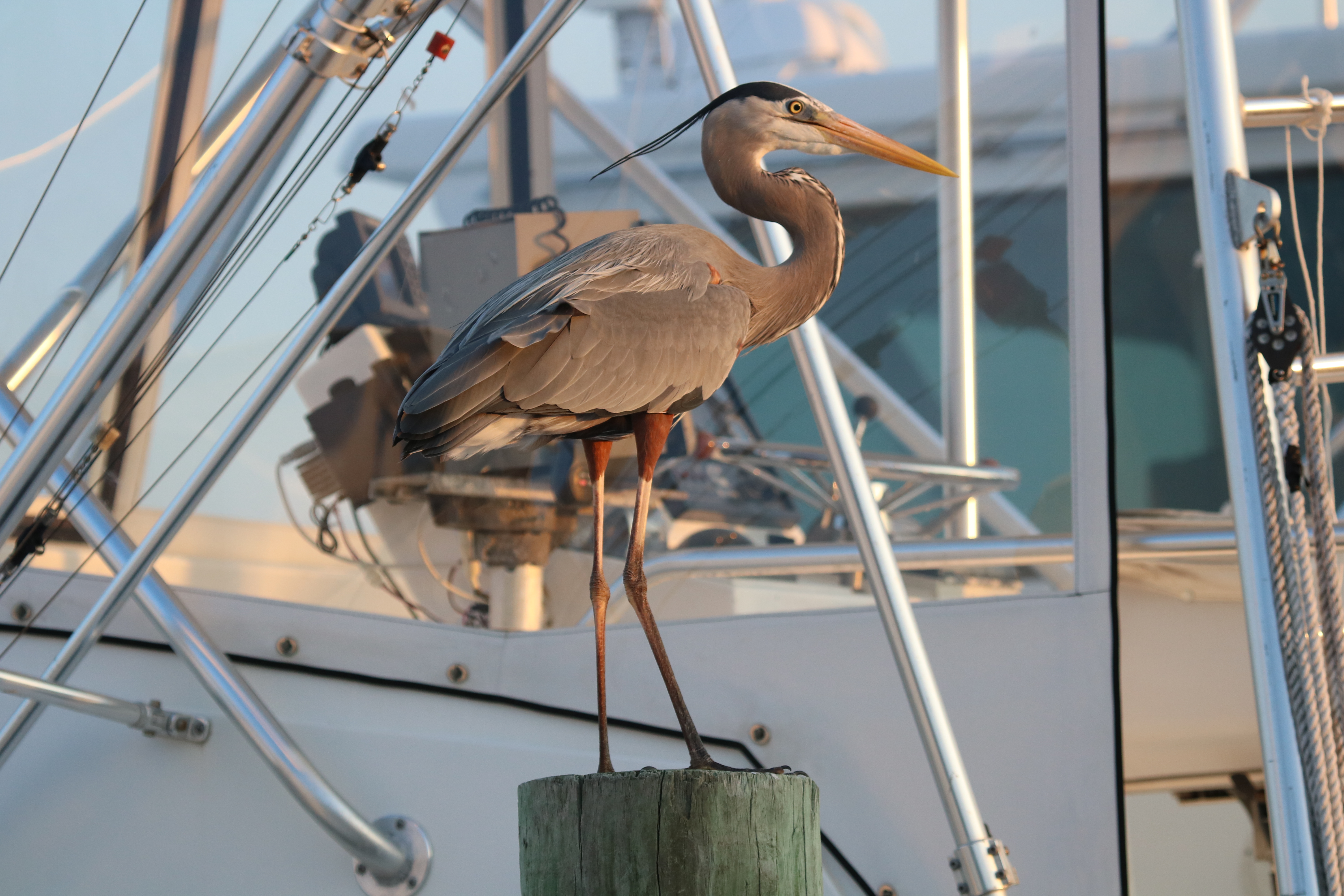 Hunting Great Blue Herons wade slowly or stand statue-like, stalking fish and other prey in shallow water or open fields. Watch for the lightning-fast thrust of the neck and head as they stab with their strong bills. Their very slow wingbeats, tucked-in neck and trailing legs create an unmistakable image in flight.