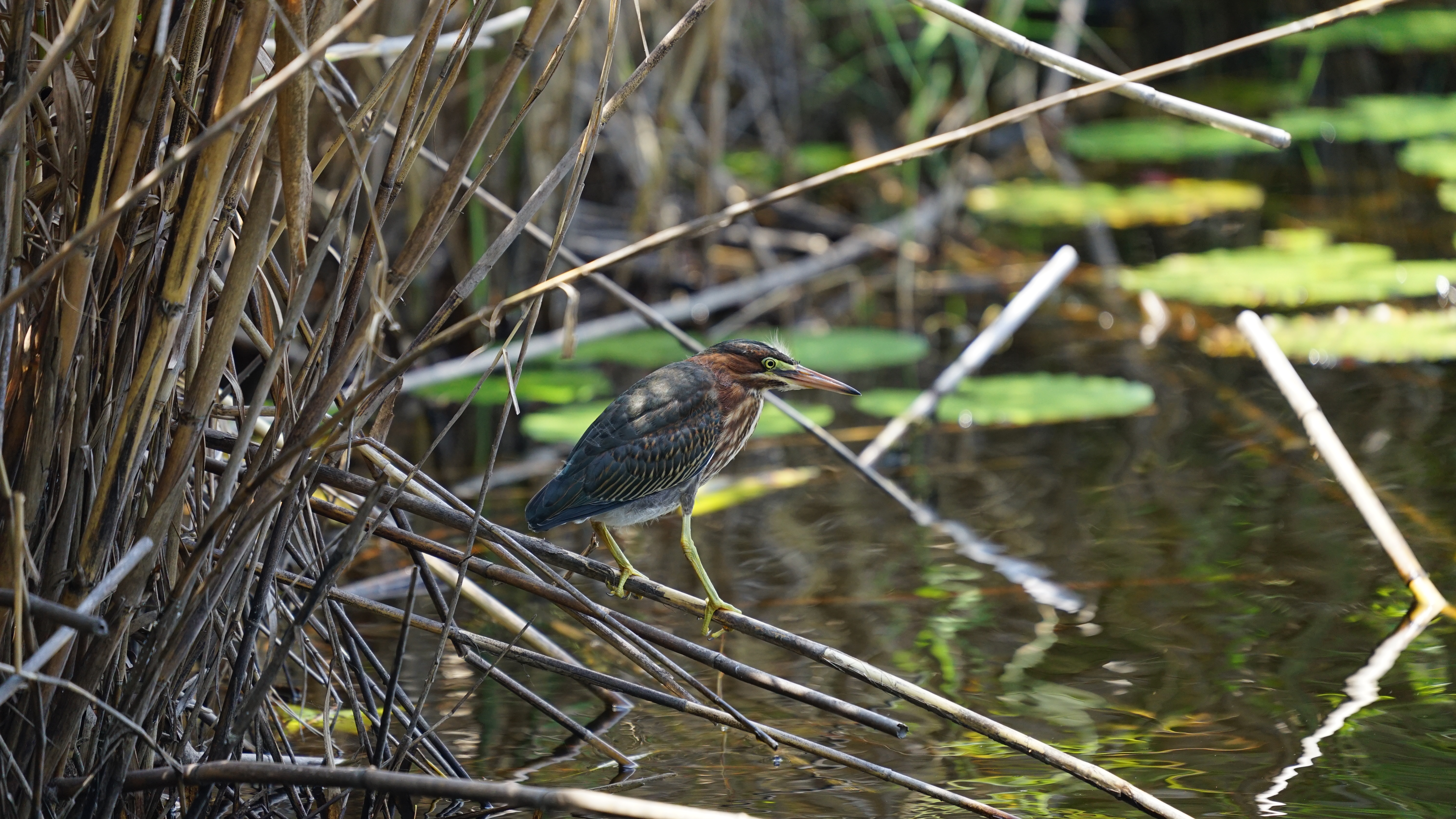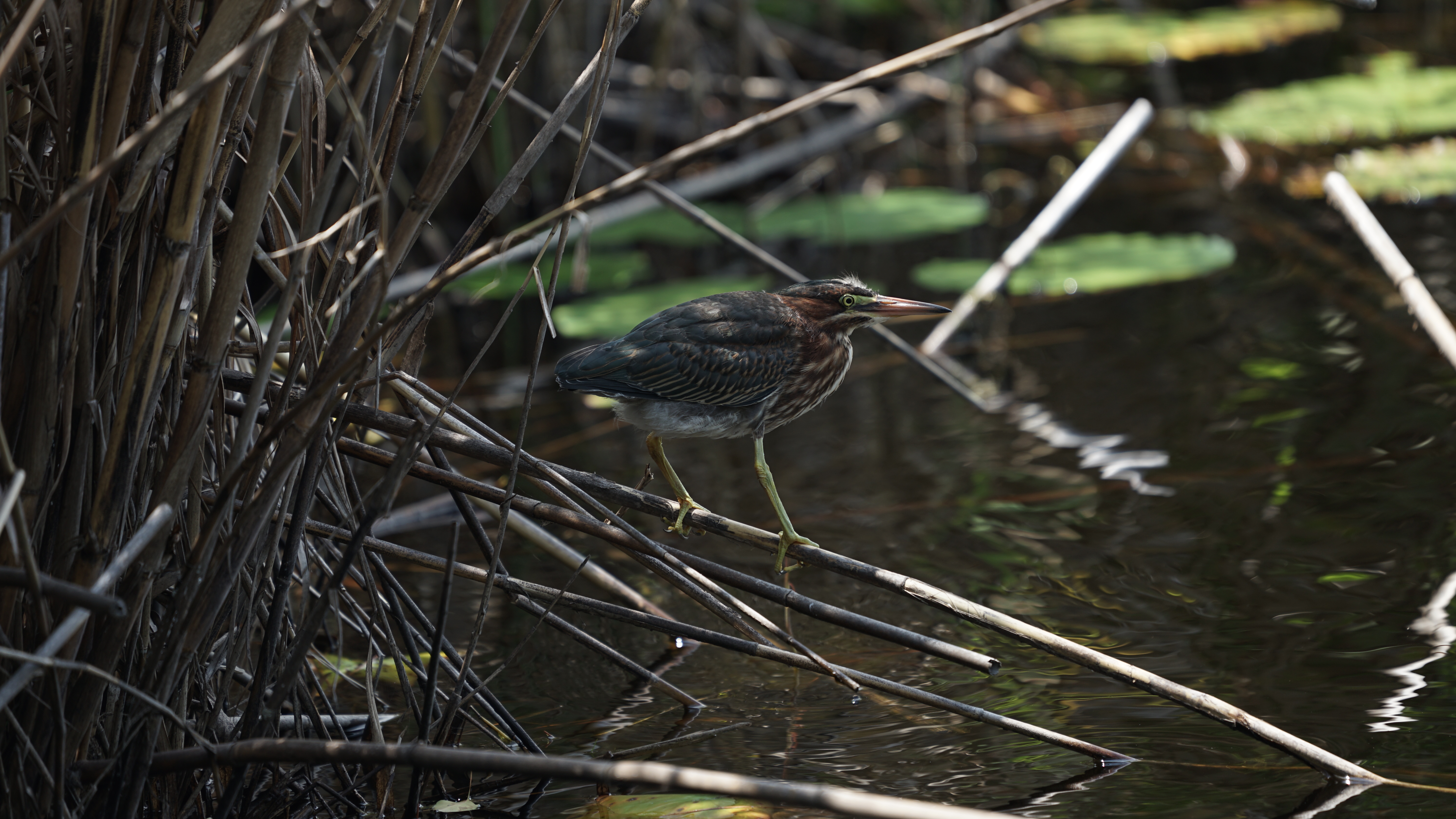 Geen herons inhabits rivers, lakes, swamps, small streams, fresh and saltwater marshes, where favorable foraging habitat abounds. Major food items are small fish, frogs, small animals, insects and miscellaneous invertebrates. Small fish rank the highest on the heron’s food list, composing 50 percent of the diet.
