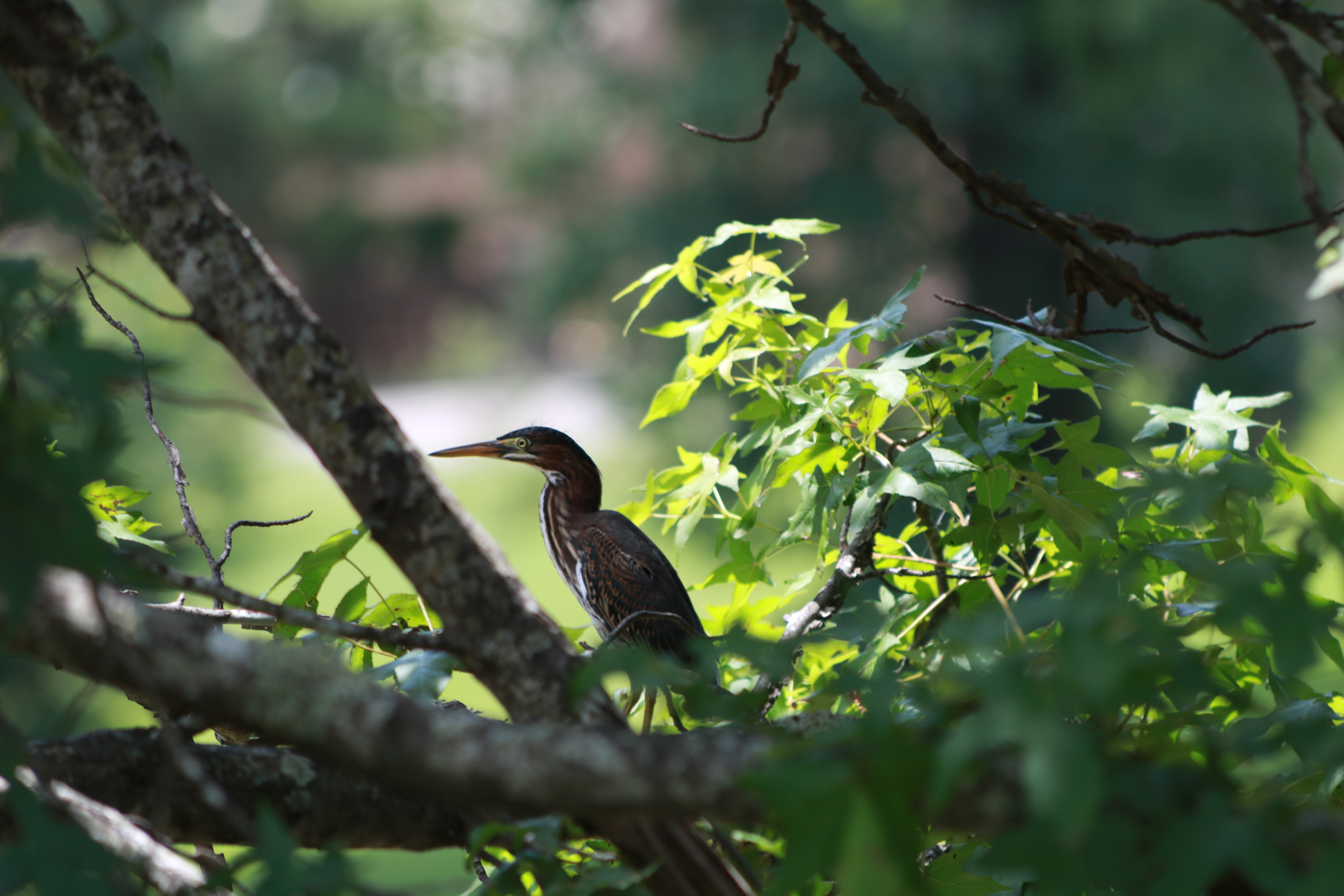 I’ll be honest this is one of the weirdest looking birds I’ve ever seen. It’s like some weird combo of bird, frog, and snake. Their necks are deceptively long as they usually keep them drawn up against their bodies until they strike at prey. Compared with most herons, Green Herons are short and stocky, with relatively short legs and thick necks. They have broad, rounded wings and a long, daggerlike bill. They sometimes raise their crown feathers into a short crest. From a distance Green Herons look all dark. In better light they are deep green on the back with a rich chestnut breast and neck. The wings are dark gray. Juveniles are browner, with pale streaking on the neck and spots on the wings.