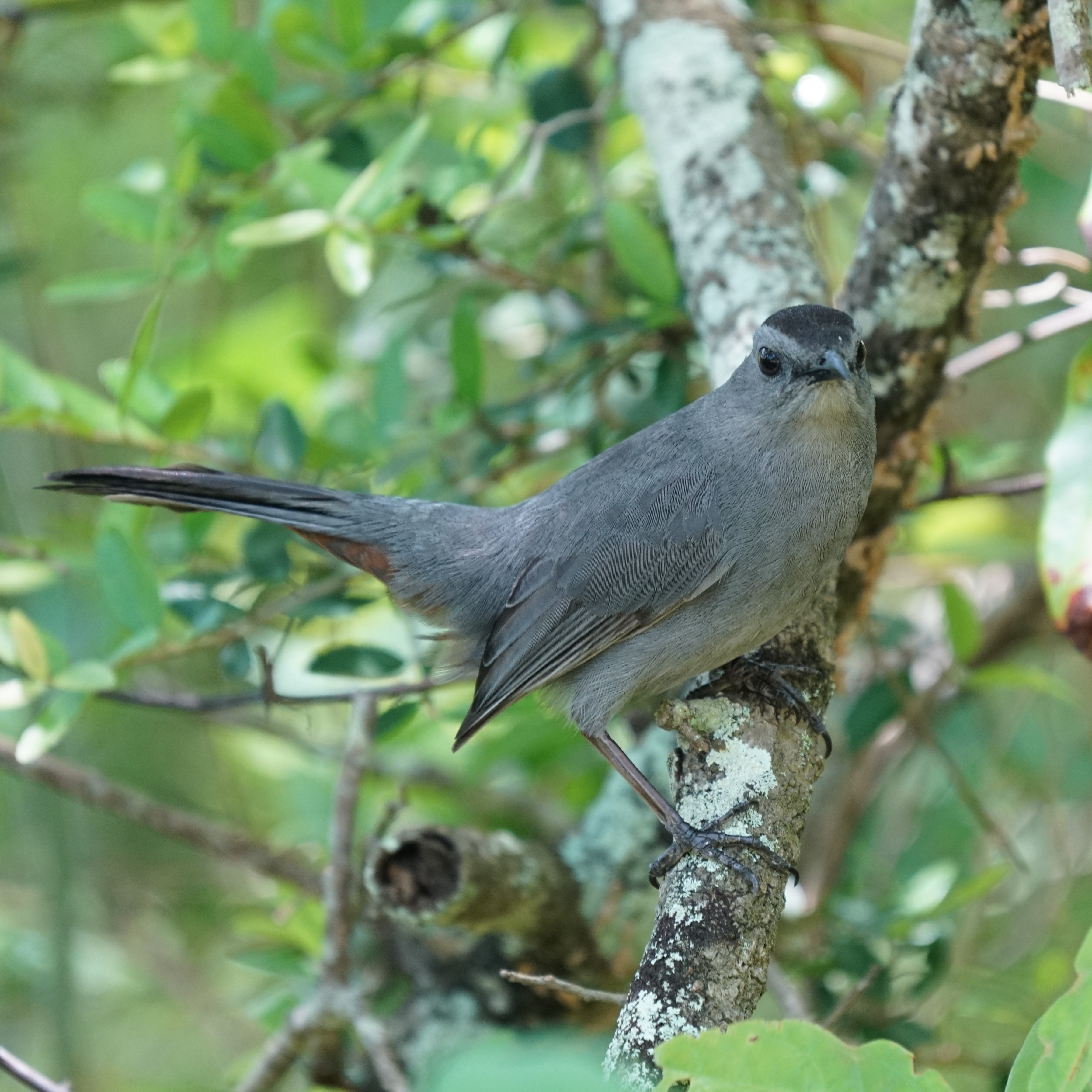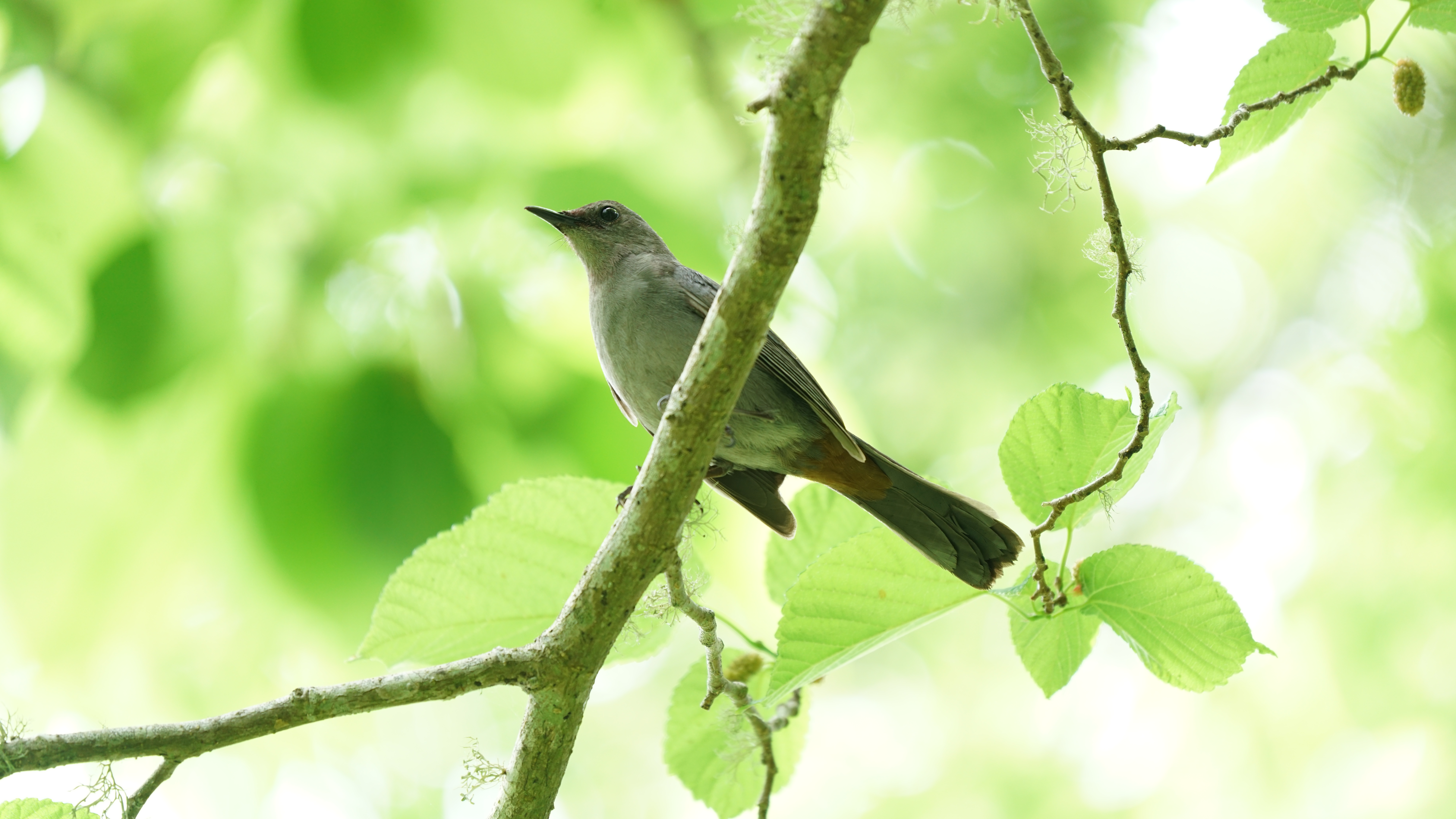 A medium-sized, slender songbird with a long, rounded, black tail and a narrow, straight bill. Catbirds are fairly long-legged and have broad, rounded wings. Catbirds give the impression of being entirely slaty gray. With a closer look, you’ll see a small black cap, blackish tail, and a rich rufous-brown patch under the tail.