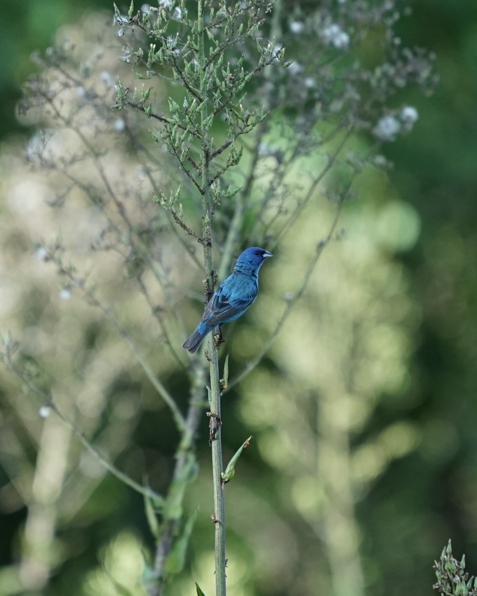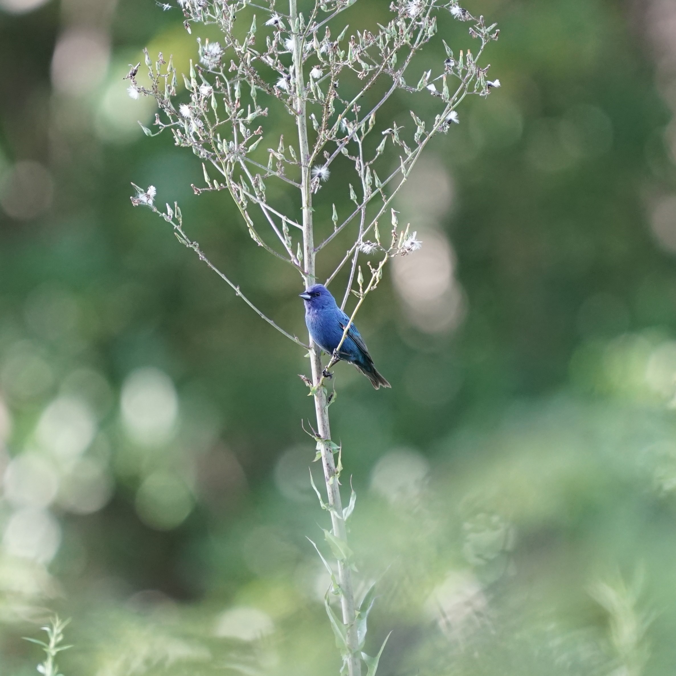 Male Indigo Buntings sing from treetops, shrubs, and telephone lines all summer. This species eats insects, seeds, and berries, and can be attracted to backyards with thistle or nyjer seed. While perching, they often swish their tails from side to side. Fairly solitary during breeding season, Indigo Buntings form large flocks during migration and on their wintering grounds.