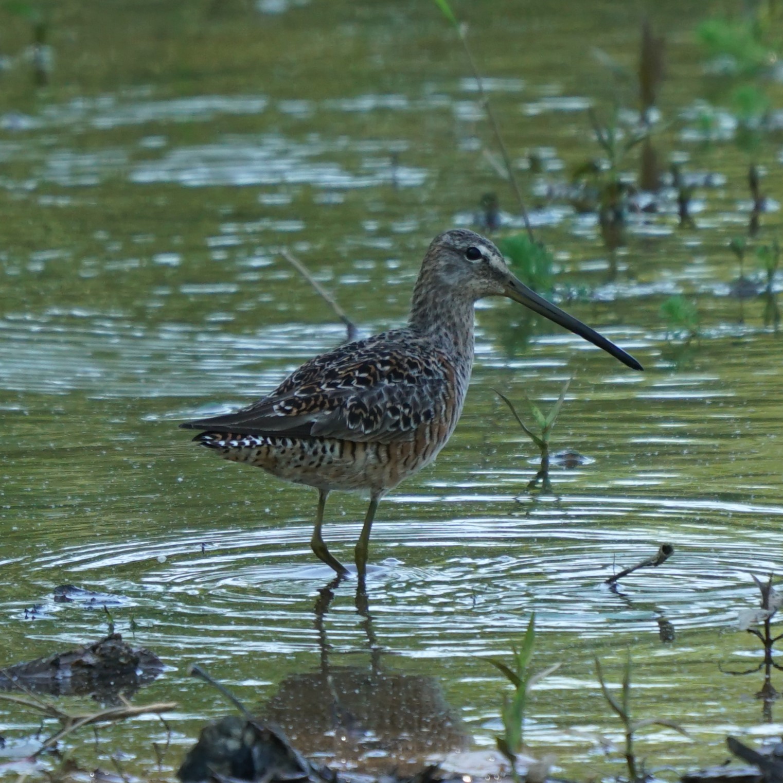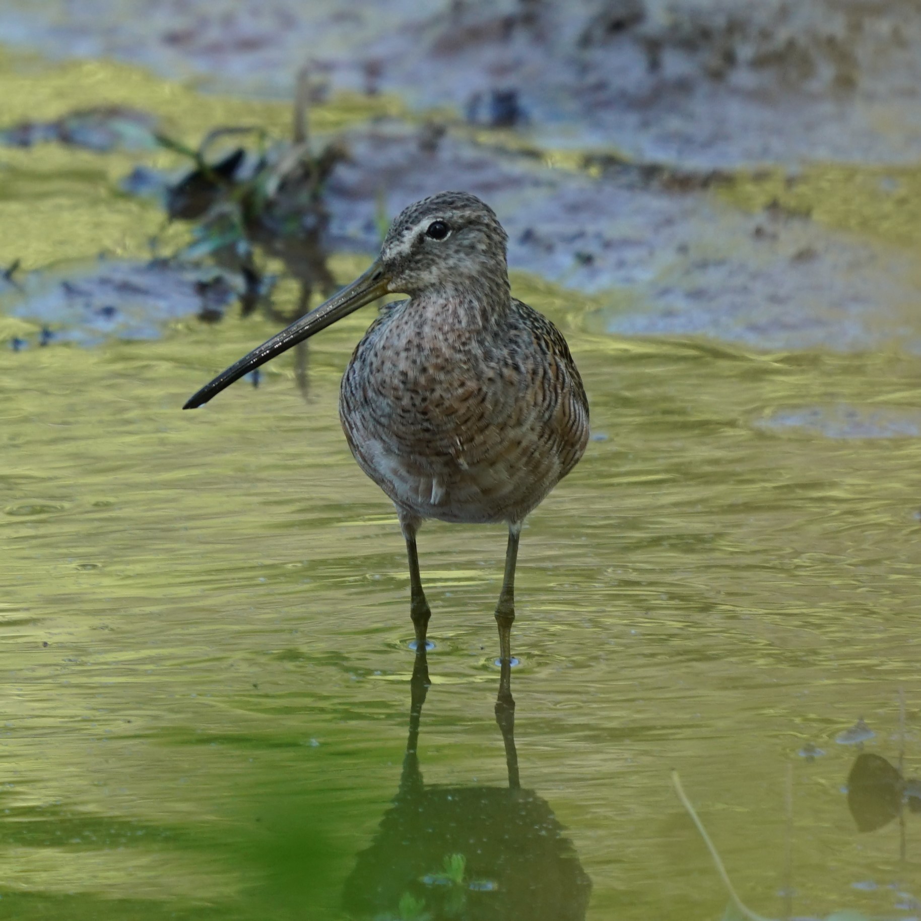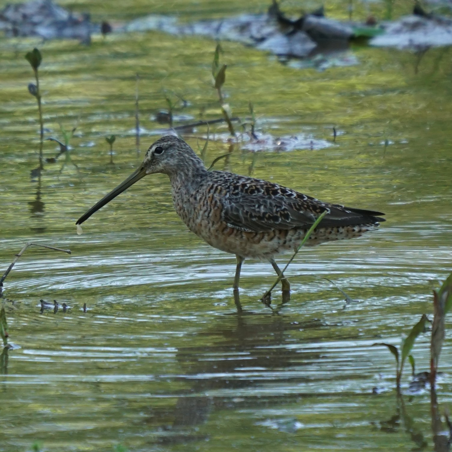 Long-billed Dowitchers probe deeply into mud or sand with an up-and-down motion likened to the needle of a sewing machine. They tend to forage in water less than about 3 inches deep. On the breeding grounds, males sing from high in the air over the territory.
