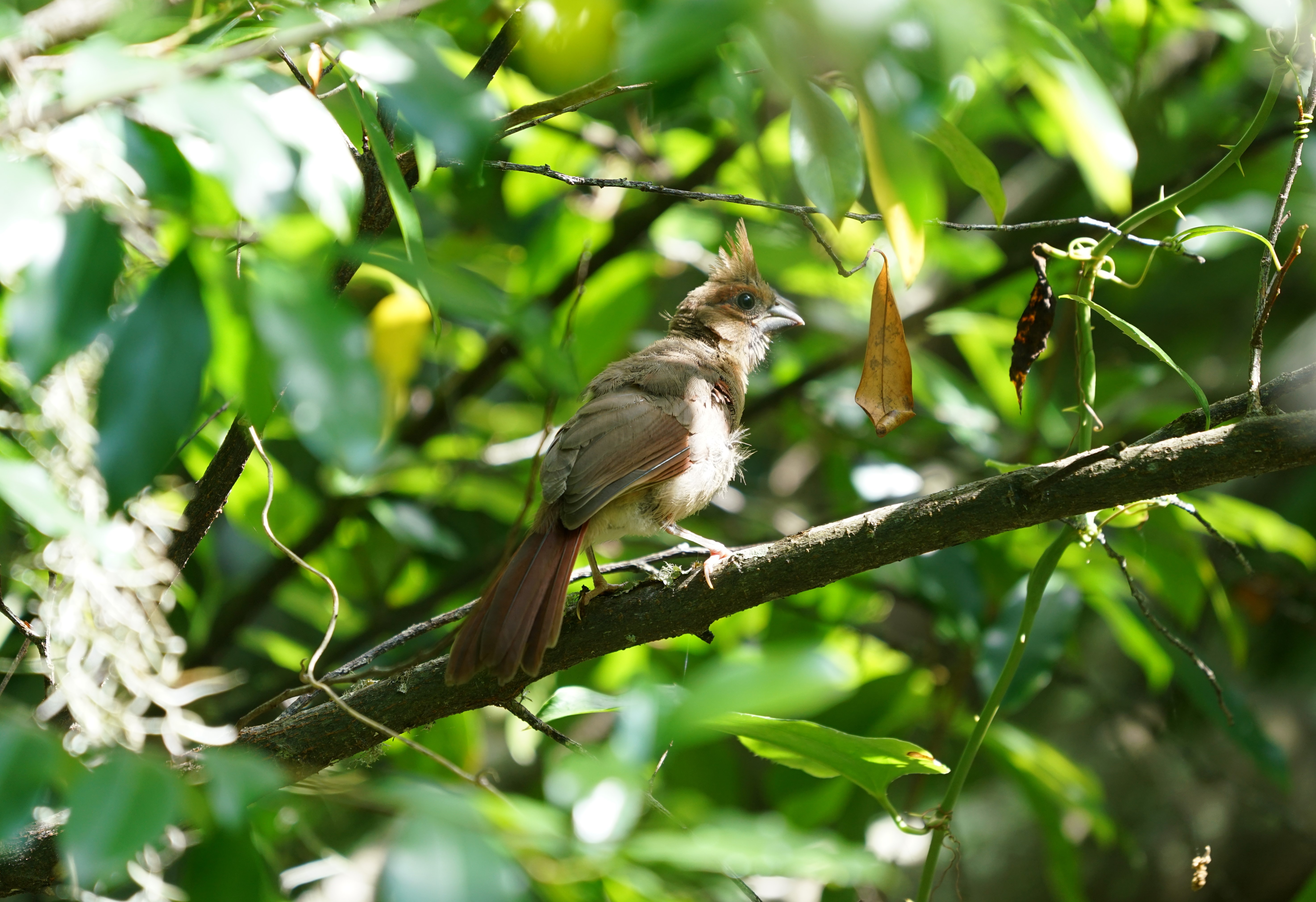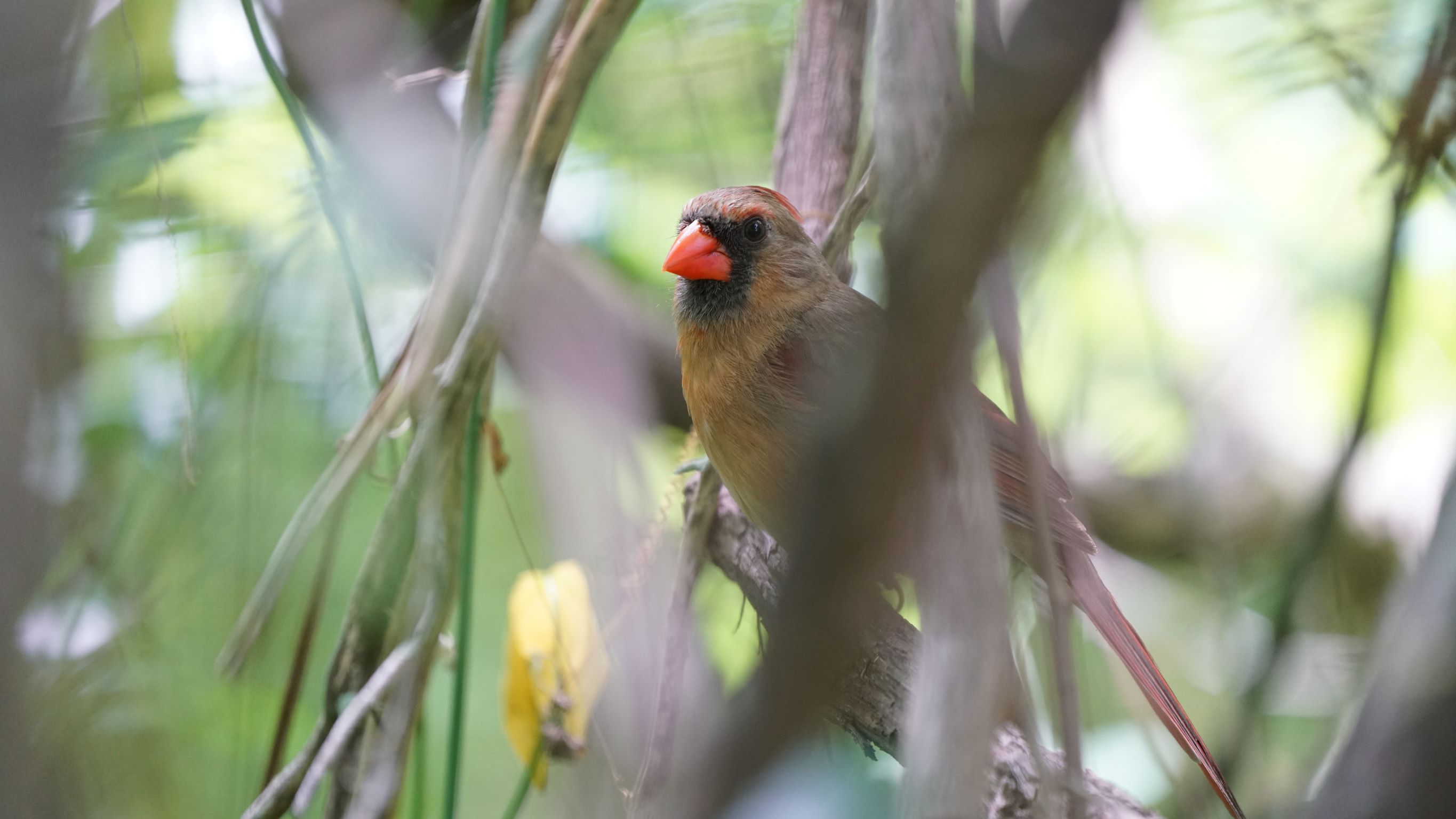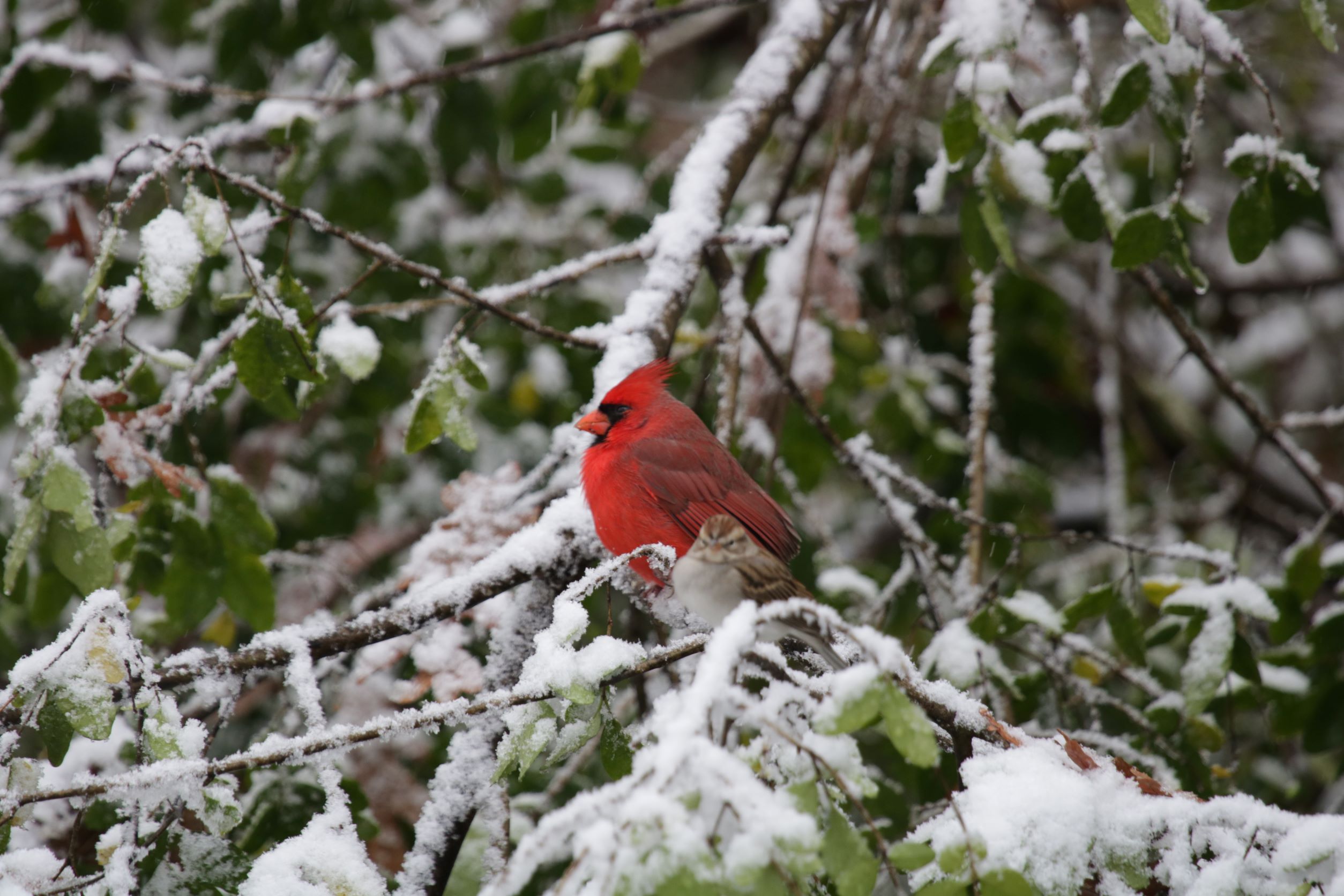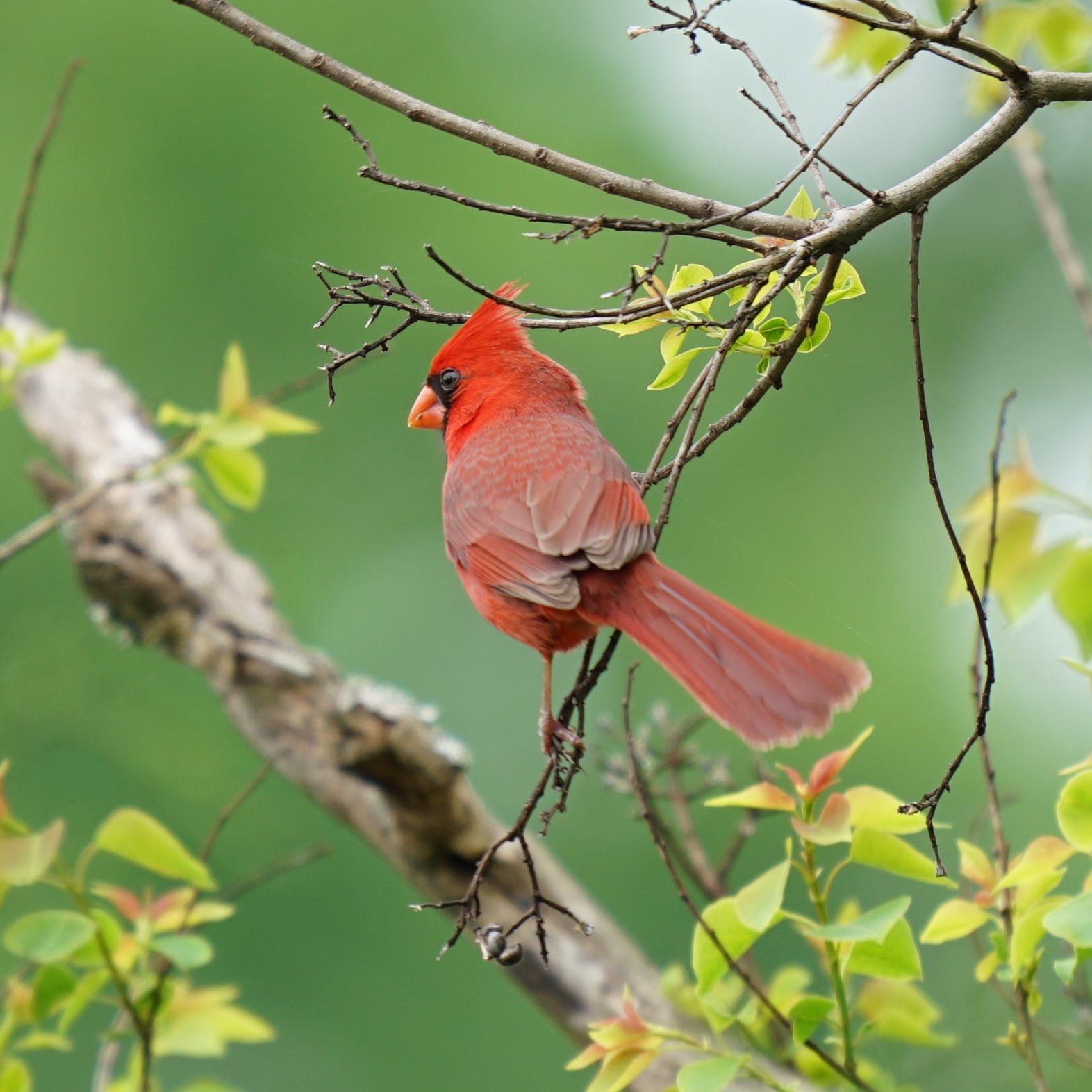 The Northern Cardinal is a fairly large, long-tailed songbird with a short, very thick bill and a prominent crest. Cardinals often sit with a hunched-over posture and with the tail pointed straight down. Male cardinals are brilliant red all over, with a reddish bill and black face immediately around the bill. Females are pale brown overall with warm reddish tinges in the wings, tail, and crest. They have the same black face and red-orange bill.