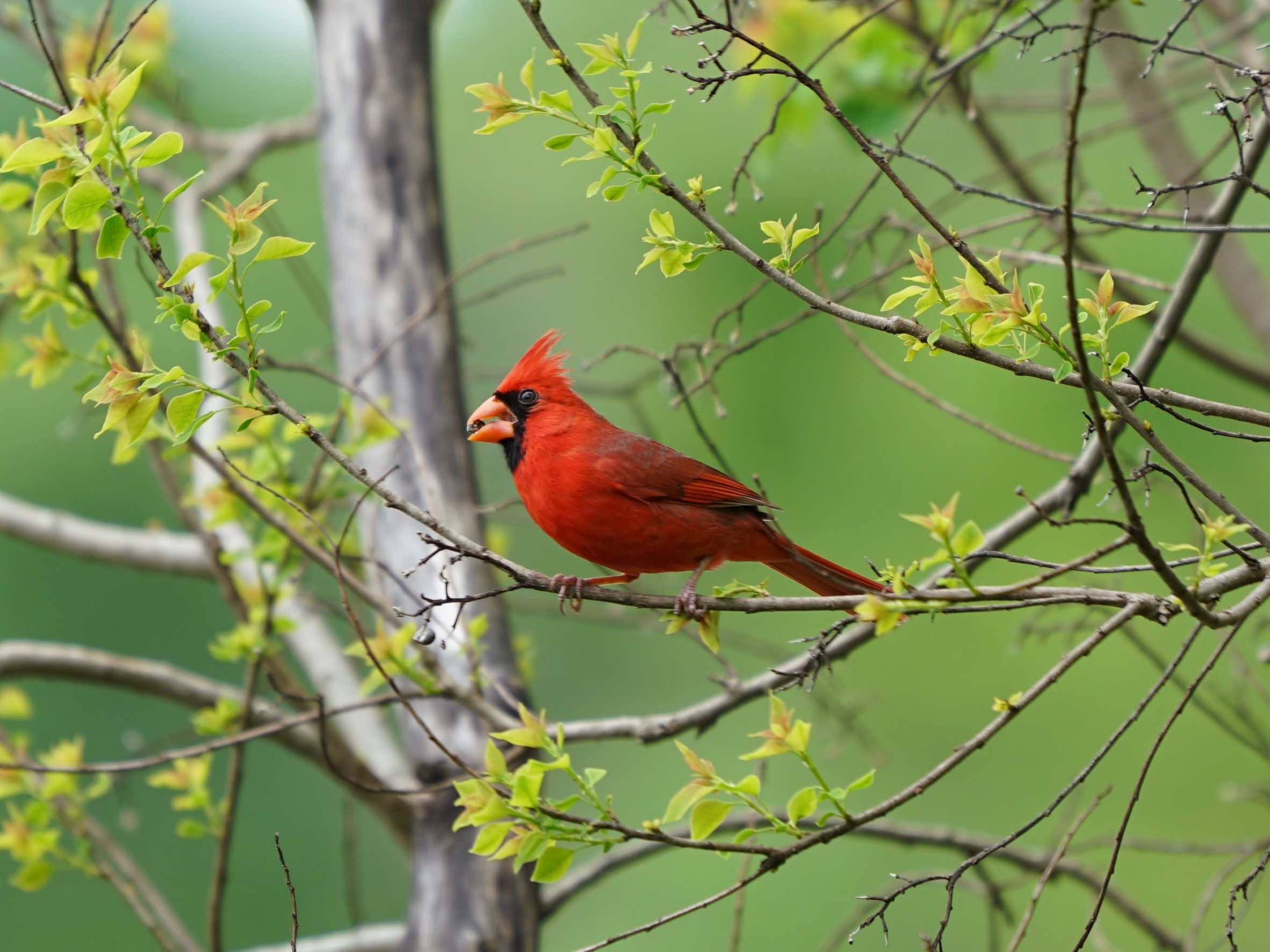 The northern cardinal diet consists of a variety of seeds, grains, insects, leaf buds, berries, and fruit. Up to one-third of the cardinal’s summer diet can be insects with the winter diet consisting mostly of large seeds. Young cardinals are fed a diet consisting largely of insects.