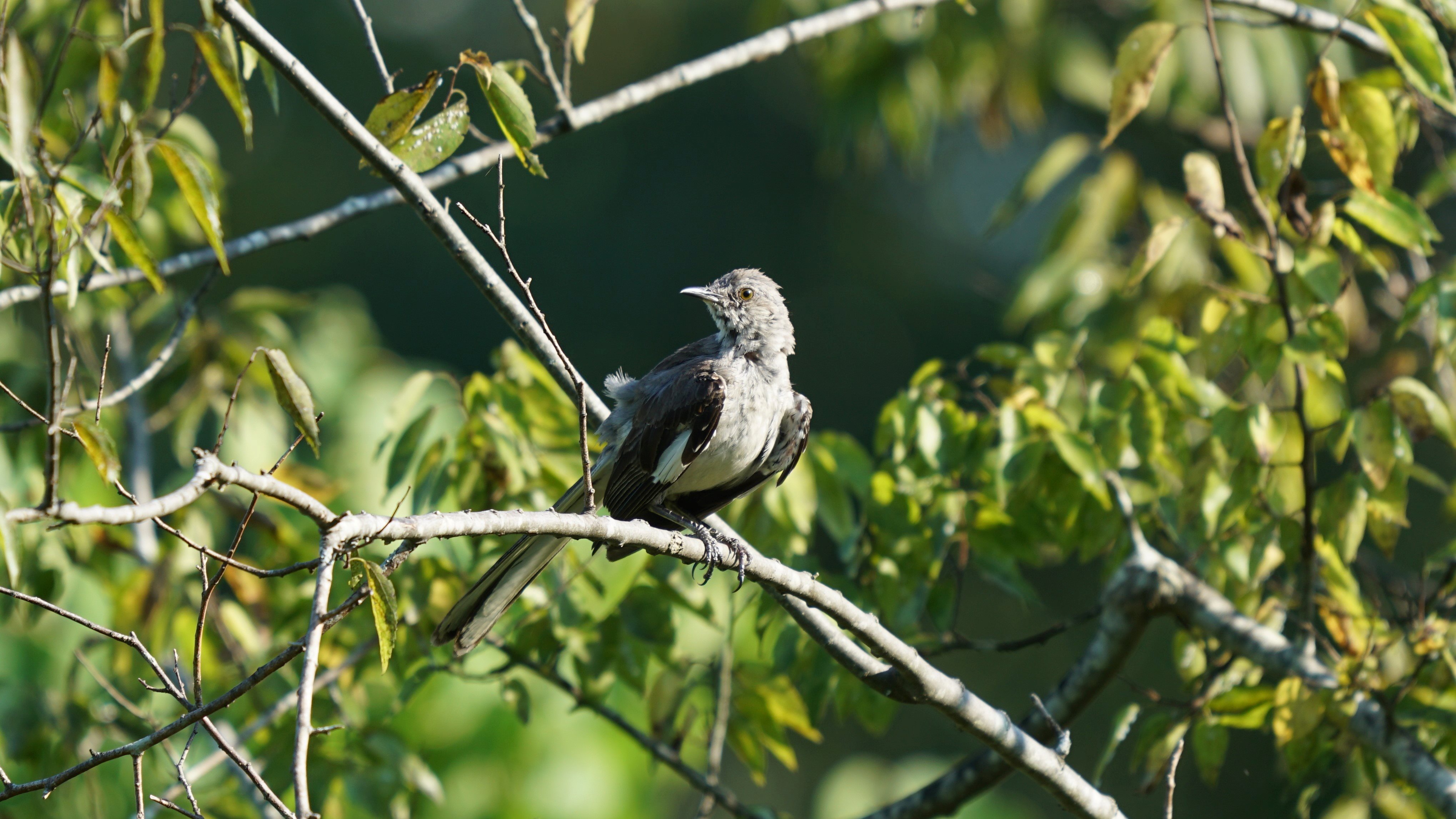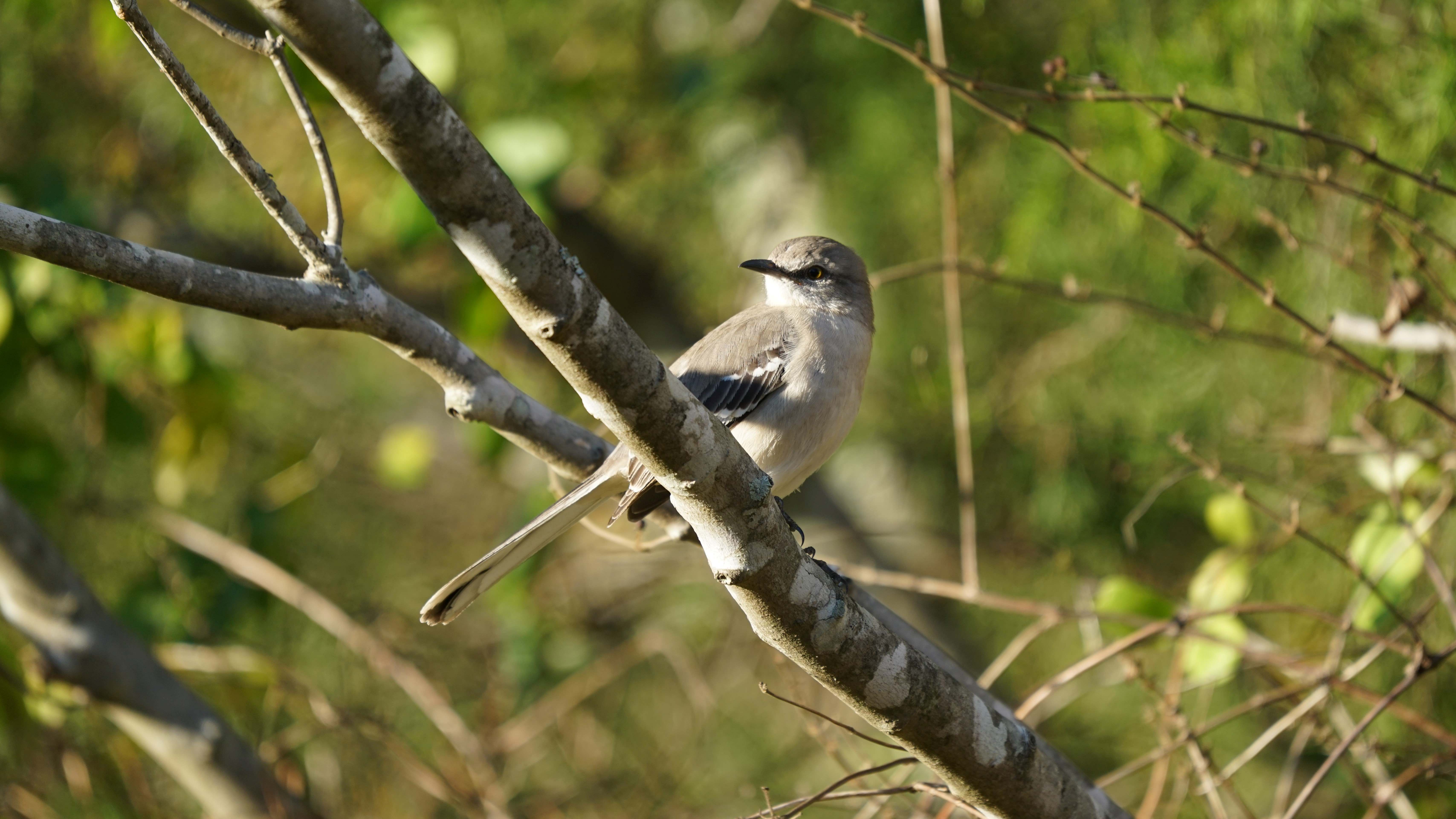 A medium-sized songbird, a bit more slender than a thrush and with a longer tail. Mockingbirds have small heads, a long, thin bill with a hint of a downward curve, and long legs. Their wings are short, rounded, and broad, making the tail seem particularly long in flight. Mockingbirds are overall gray-brown, paler on the breast and belly, with two white wingbars on each wing. A white patch in each wing is often visible on perched birds, and in flight these become large white flashes. The white outer tail feathers are also flashy in flight.