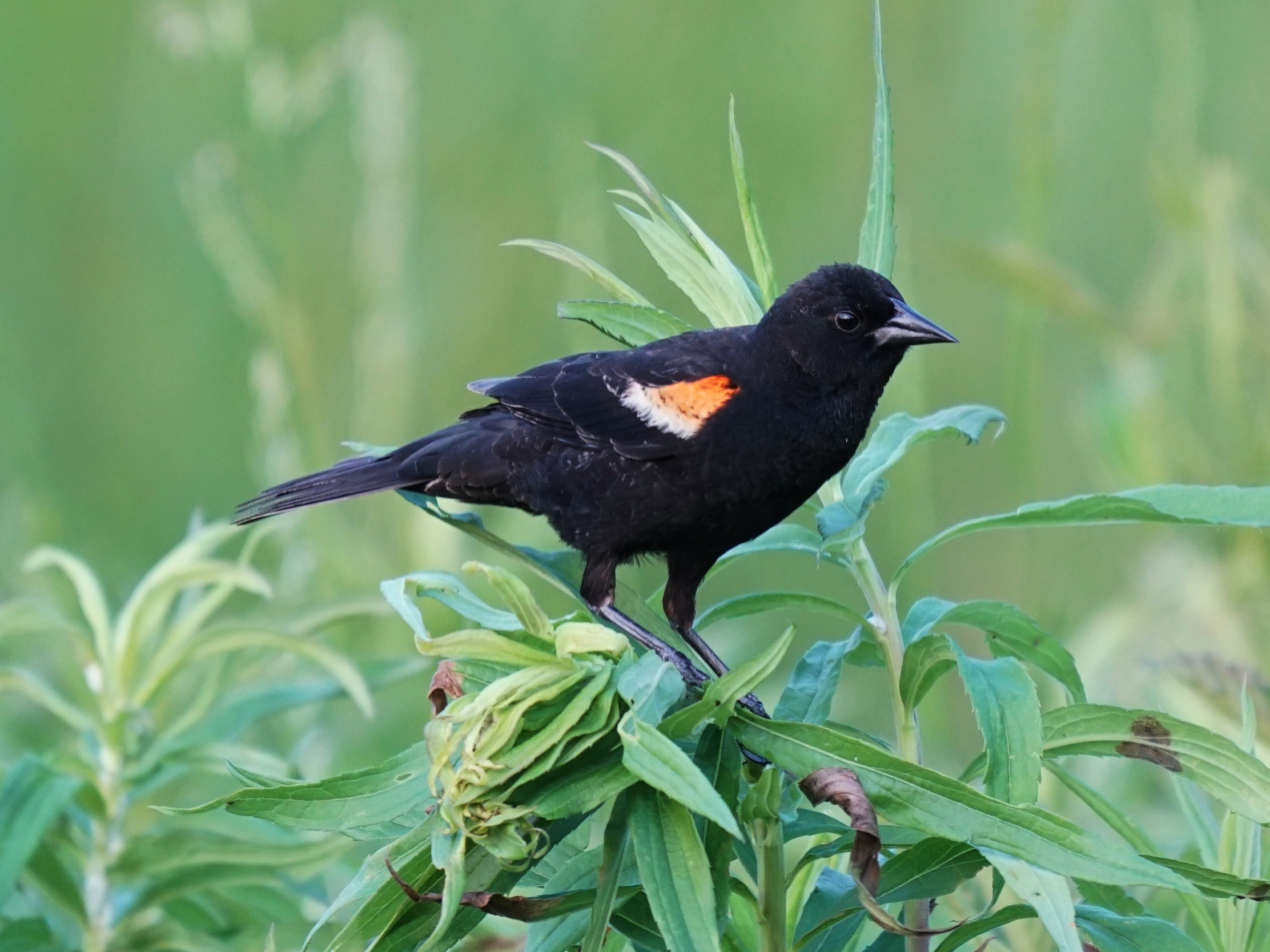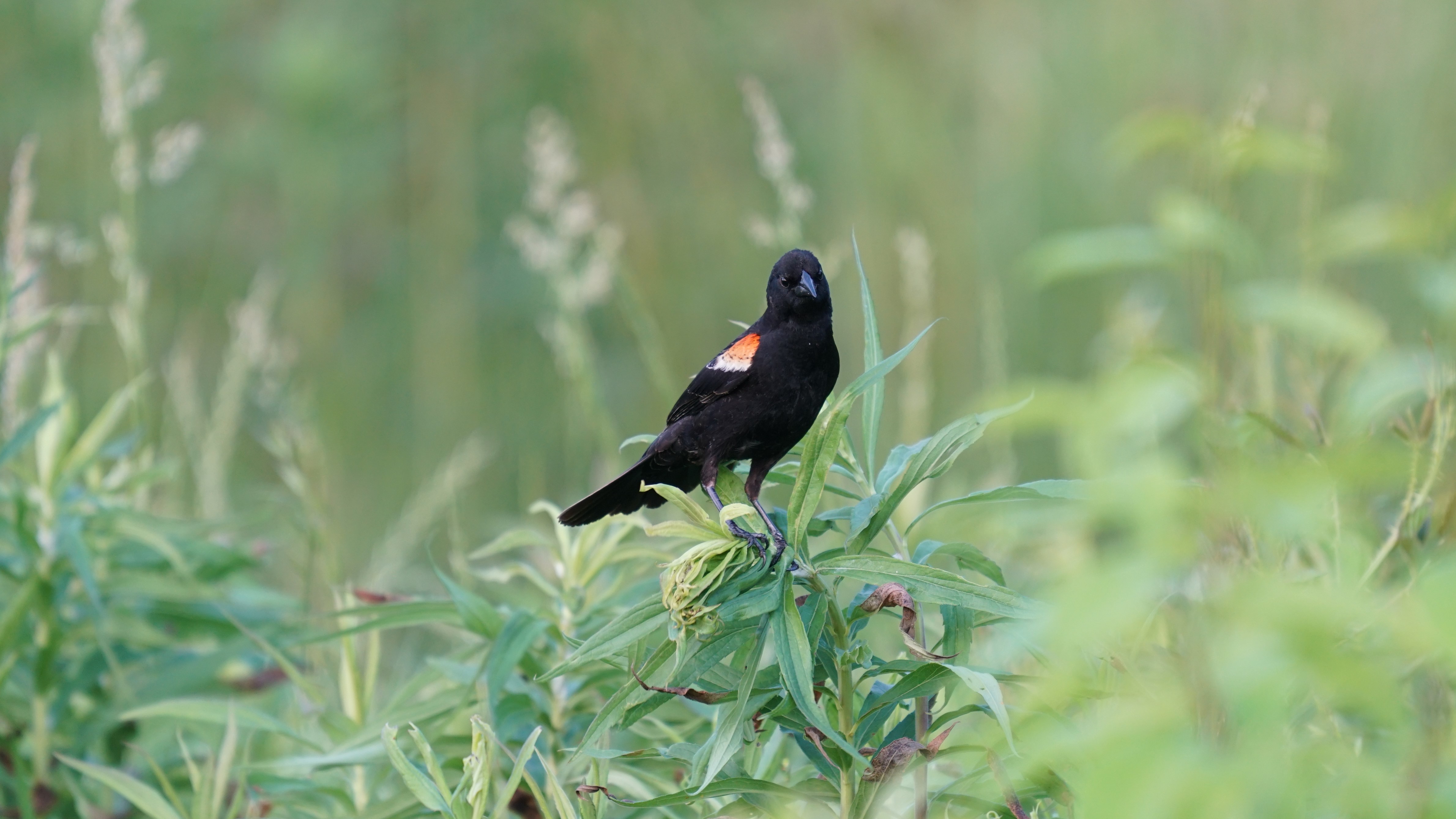 Breeds in swampy areas and marshes and along edges of fields; may also be found feeding in agricultural fields with mixed flocks of starlings, cowbirds, and grackles.