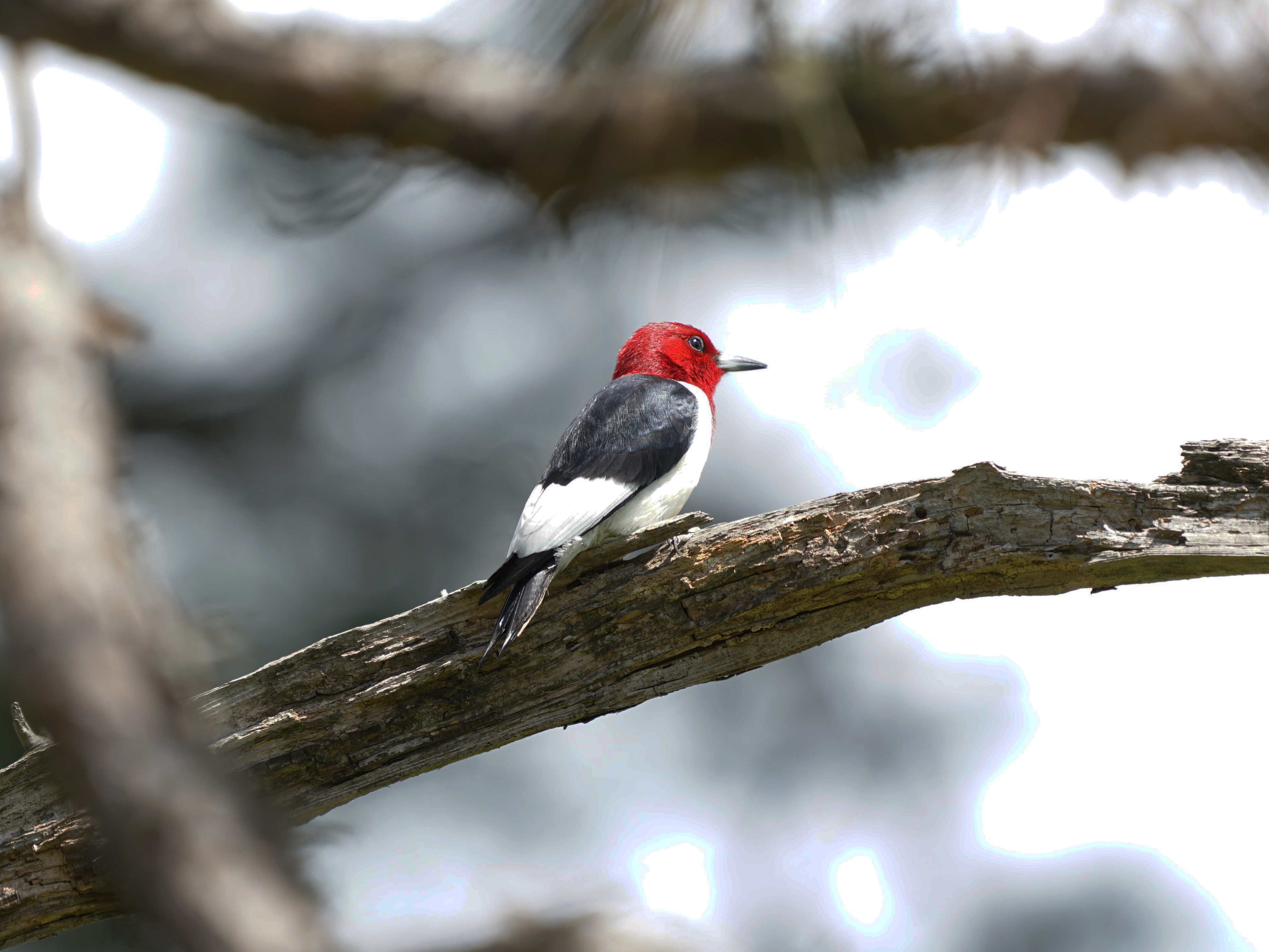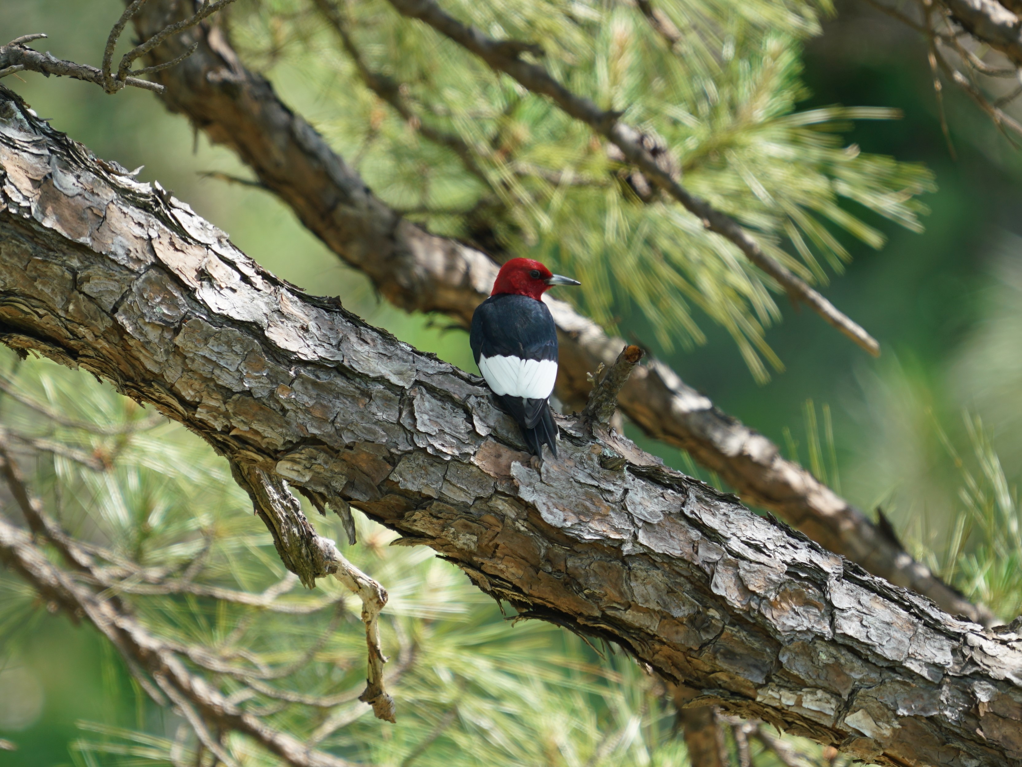 The red-headed woodpecker (melanerpes erythrocephalus) is the only eastern woodpecker with an entirely red head. It has a solid black back, white rump, and large white patches on the wings, making the lower back appear white when the bird is at rest. Immature birds appear to have a dusky-colored head.