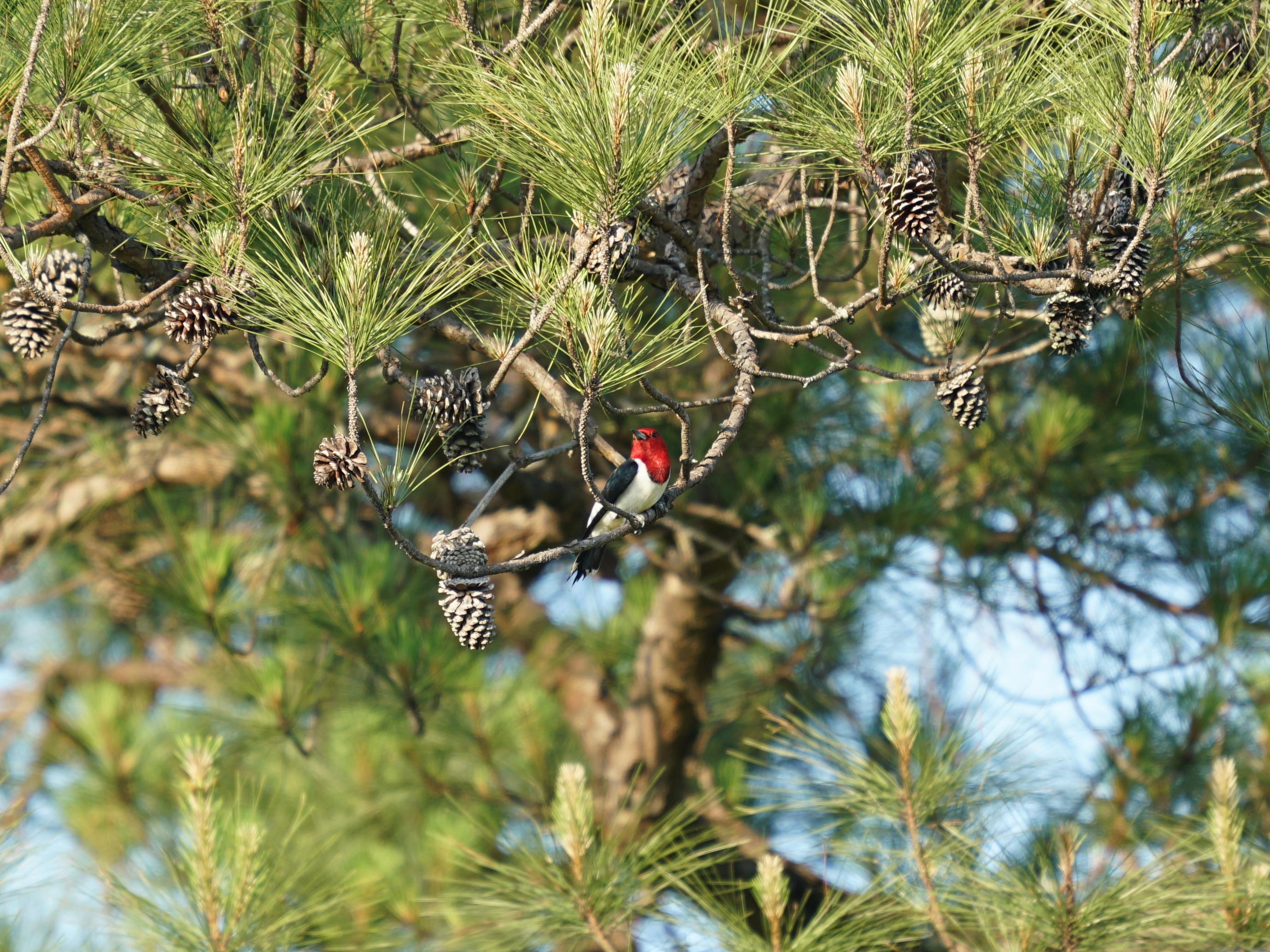 The red-headed woodpecker is found in a number of habitat types including wooded savannas, open woodlands, riparian forests, orchards, suburbia, and agricultural lands. Preferred habitat includes dead trees for nest sites, relatively open undergrowth, and access to the ground for foraging.