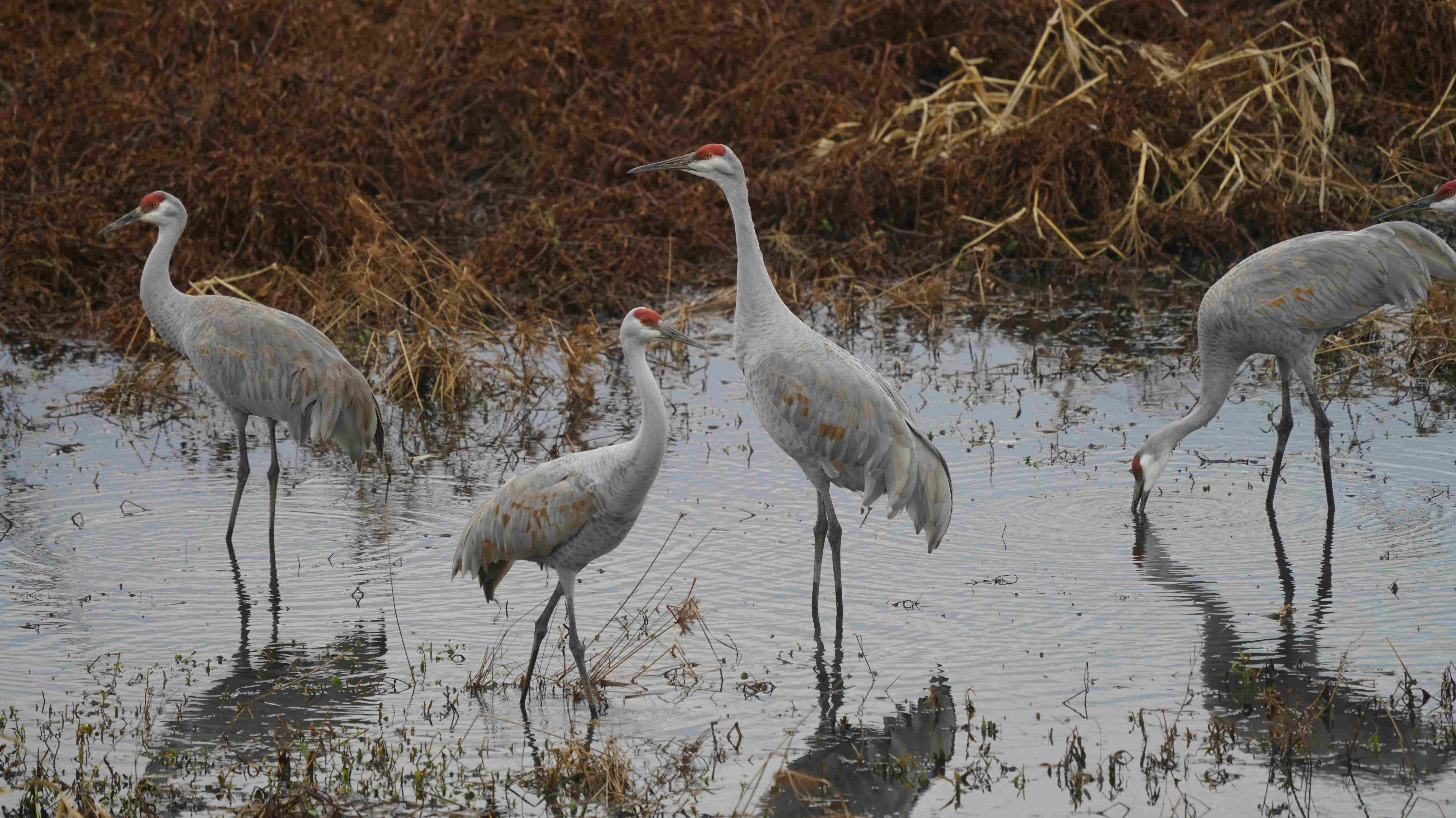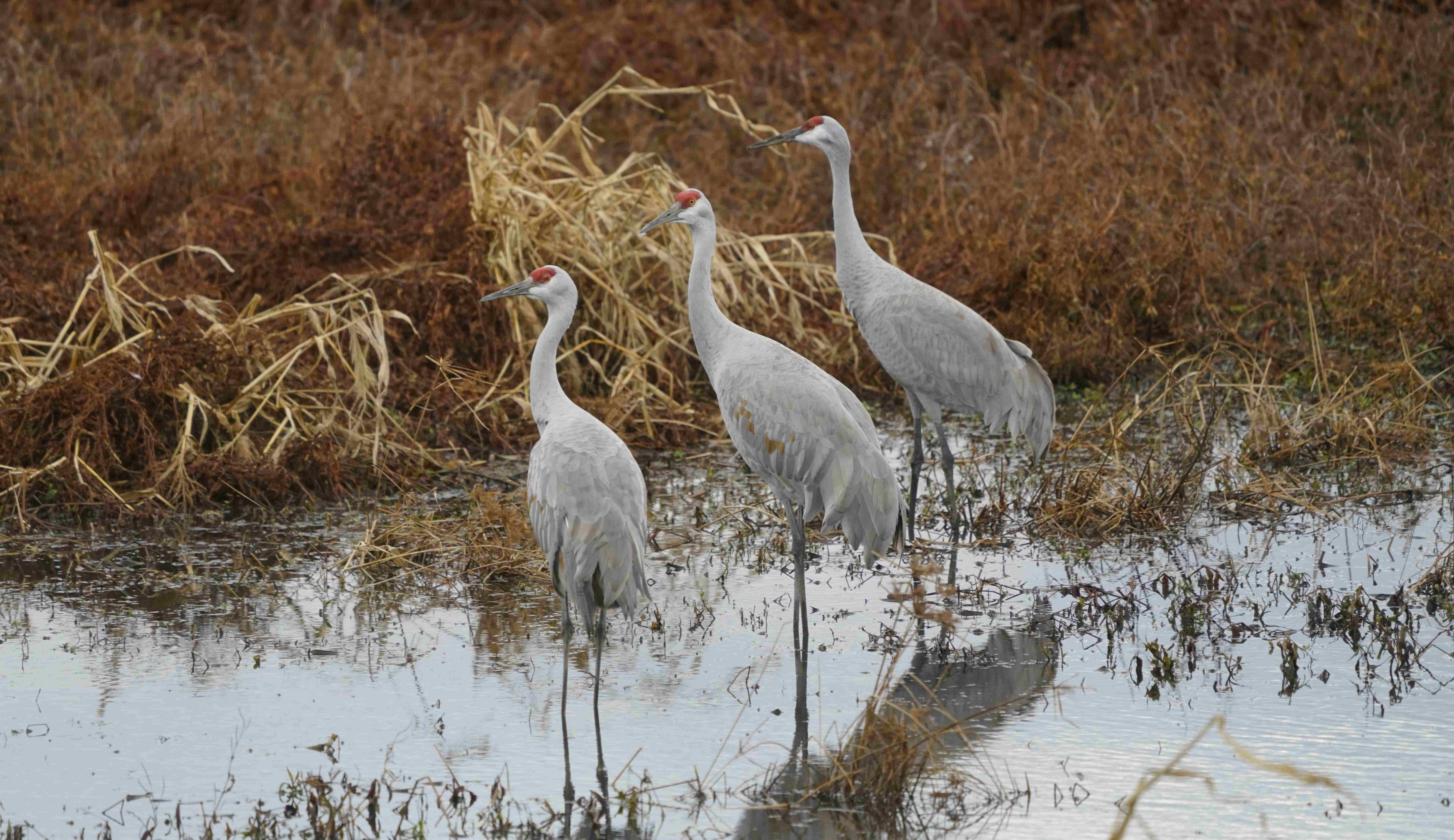 Sandhill Cranes winter in the southern U.S. and northern Mexico, roosting on shallow lakes or rivers at night and spending the day in irrigated croplands, pastures, grasslands, or wetlands. Large numbers can be found at Wheeler NWR during the winter months with peak numbers reached during early January.