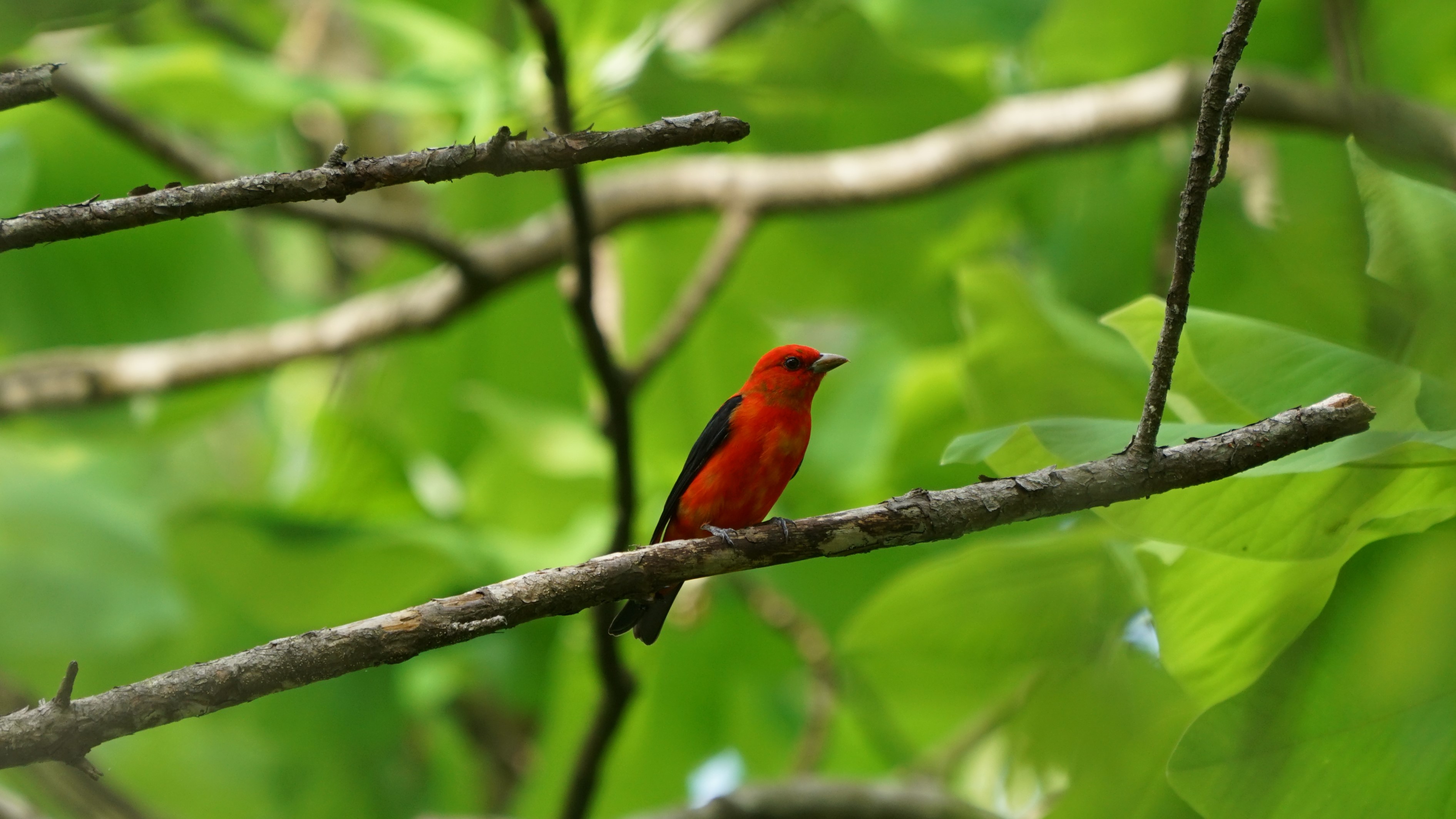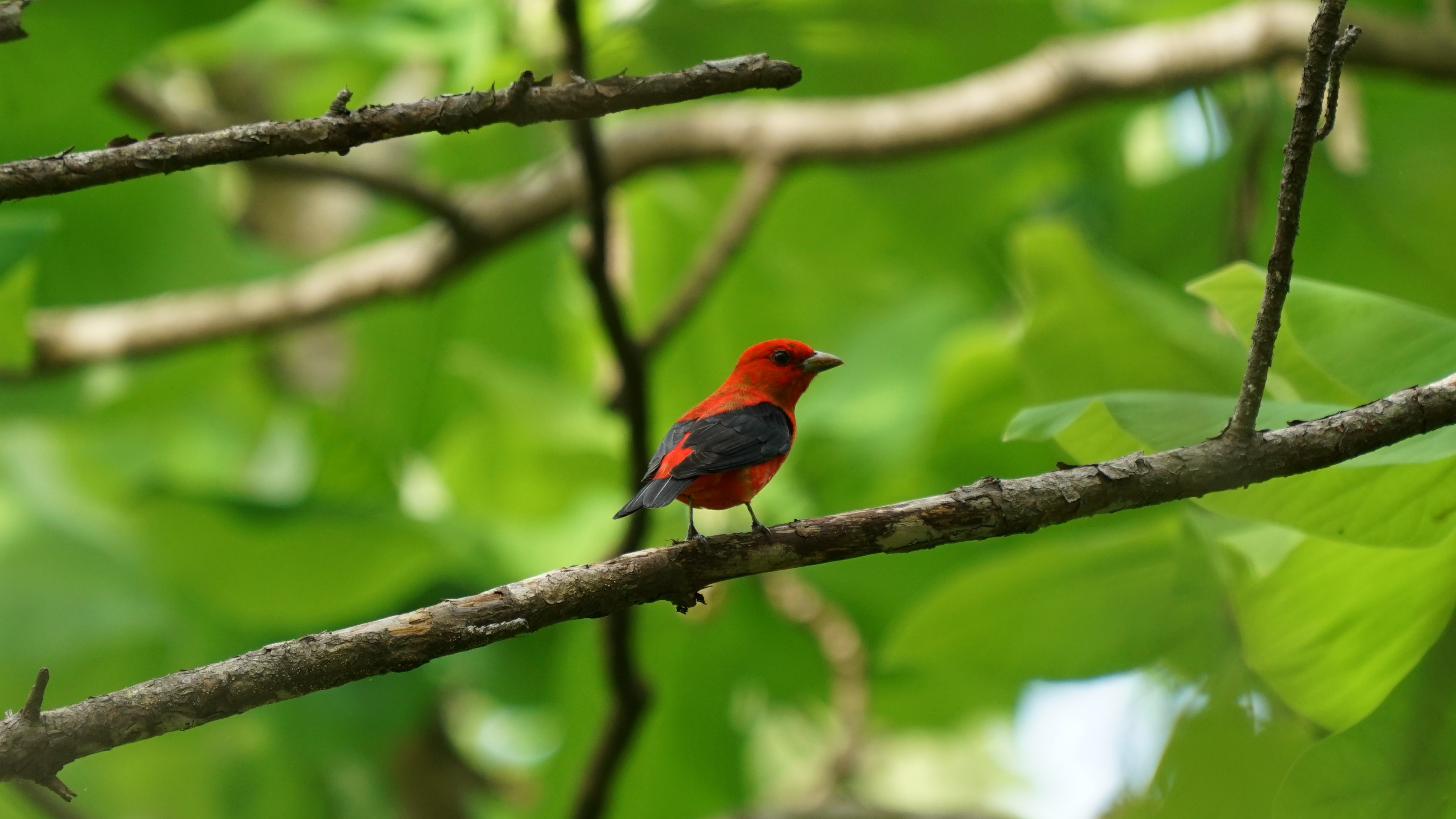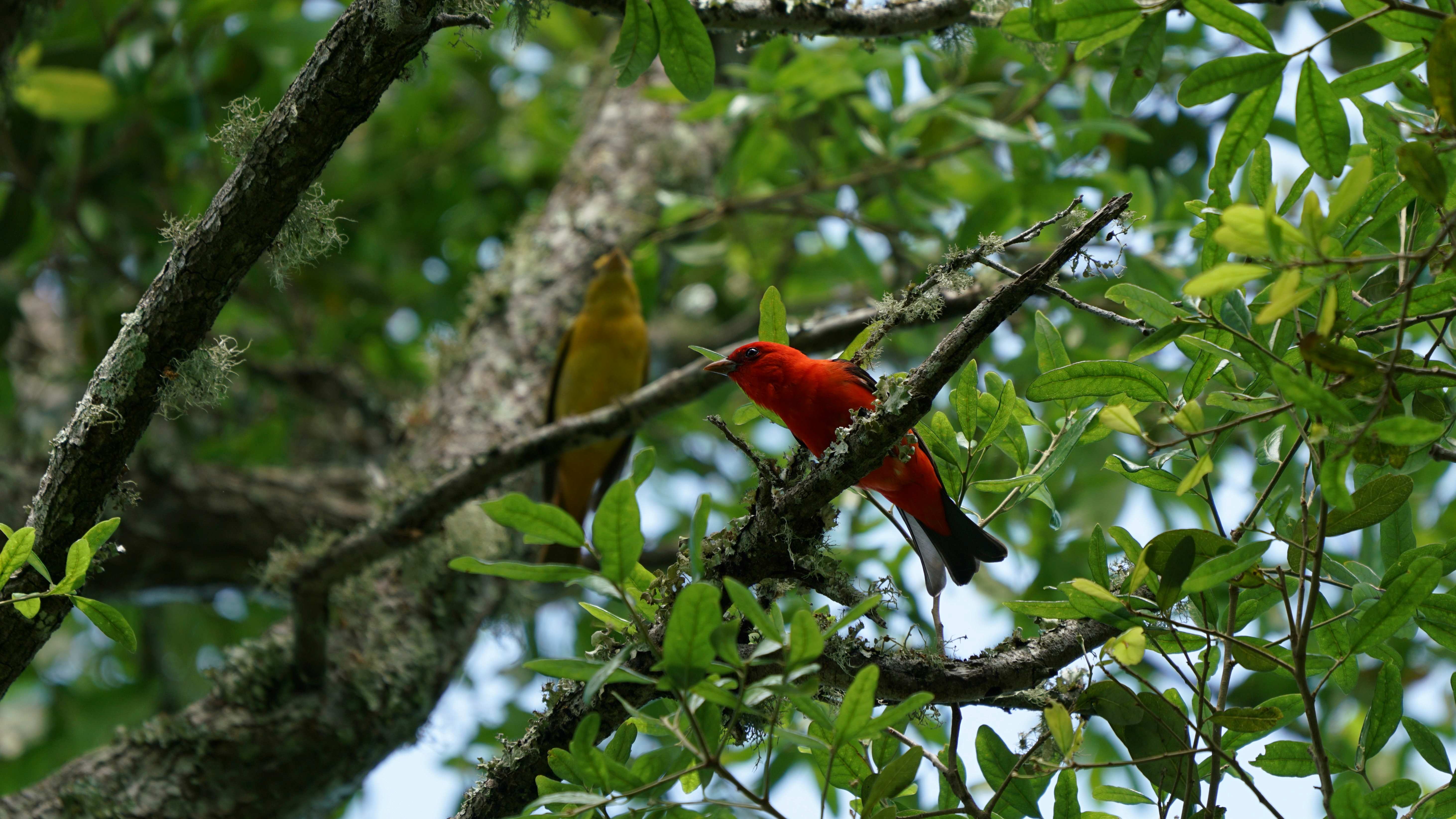 Primarily insectivorous during the summer, Scarlet Tanagers also eat fruit during migration and on the wintering grounds. They spend much of their time skulking among the wide leaves of deciduous trees in the forest canopy, where they are hard to see. They sing a burry, rambling song and give a distinctive, harsh chick-burr call.